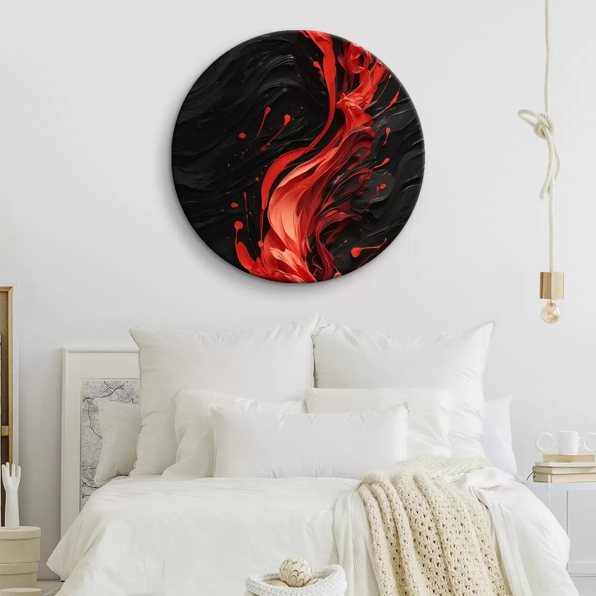 Quadri rotondi Flusso di vernice rossa su sfondo nero astratto r44889