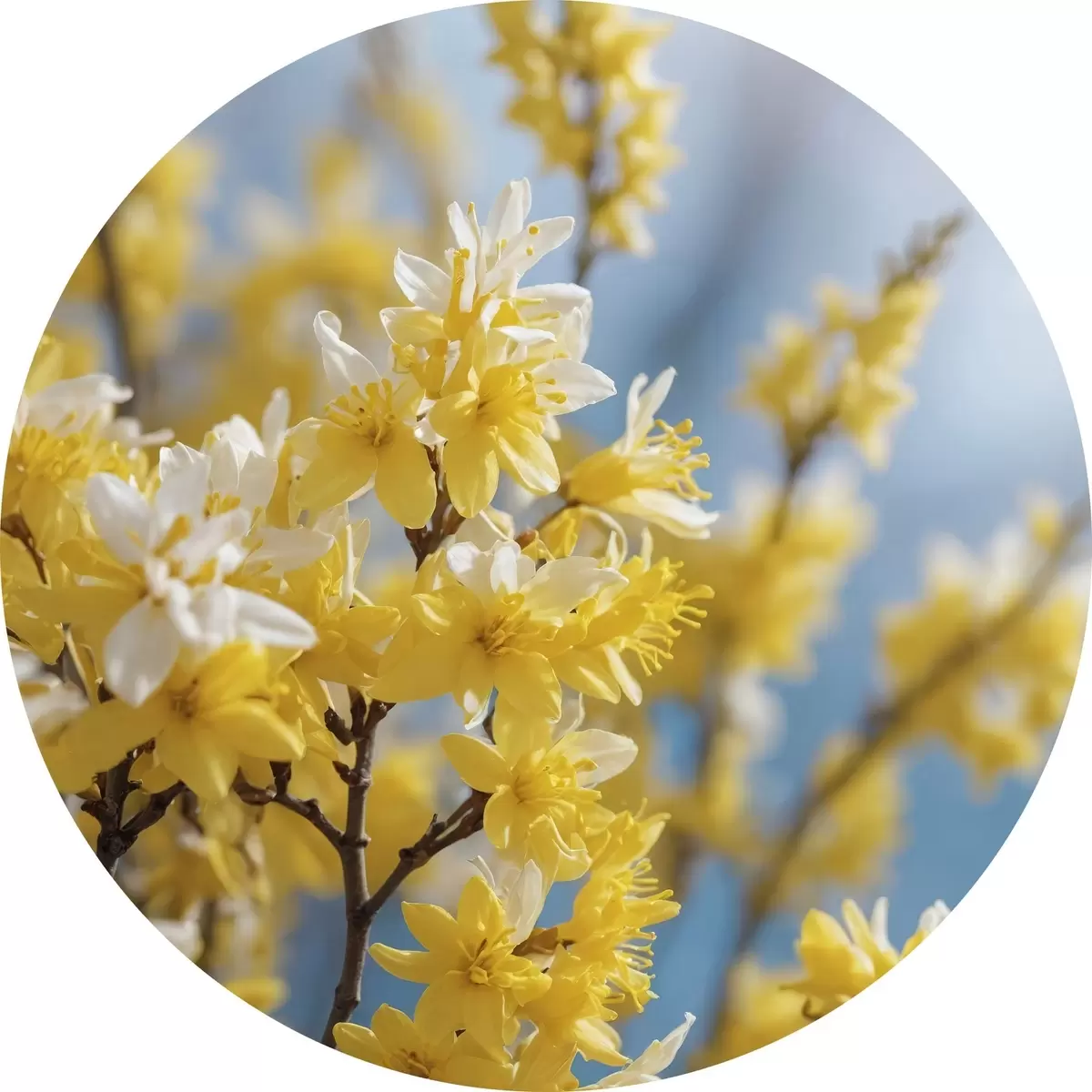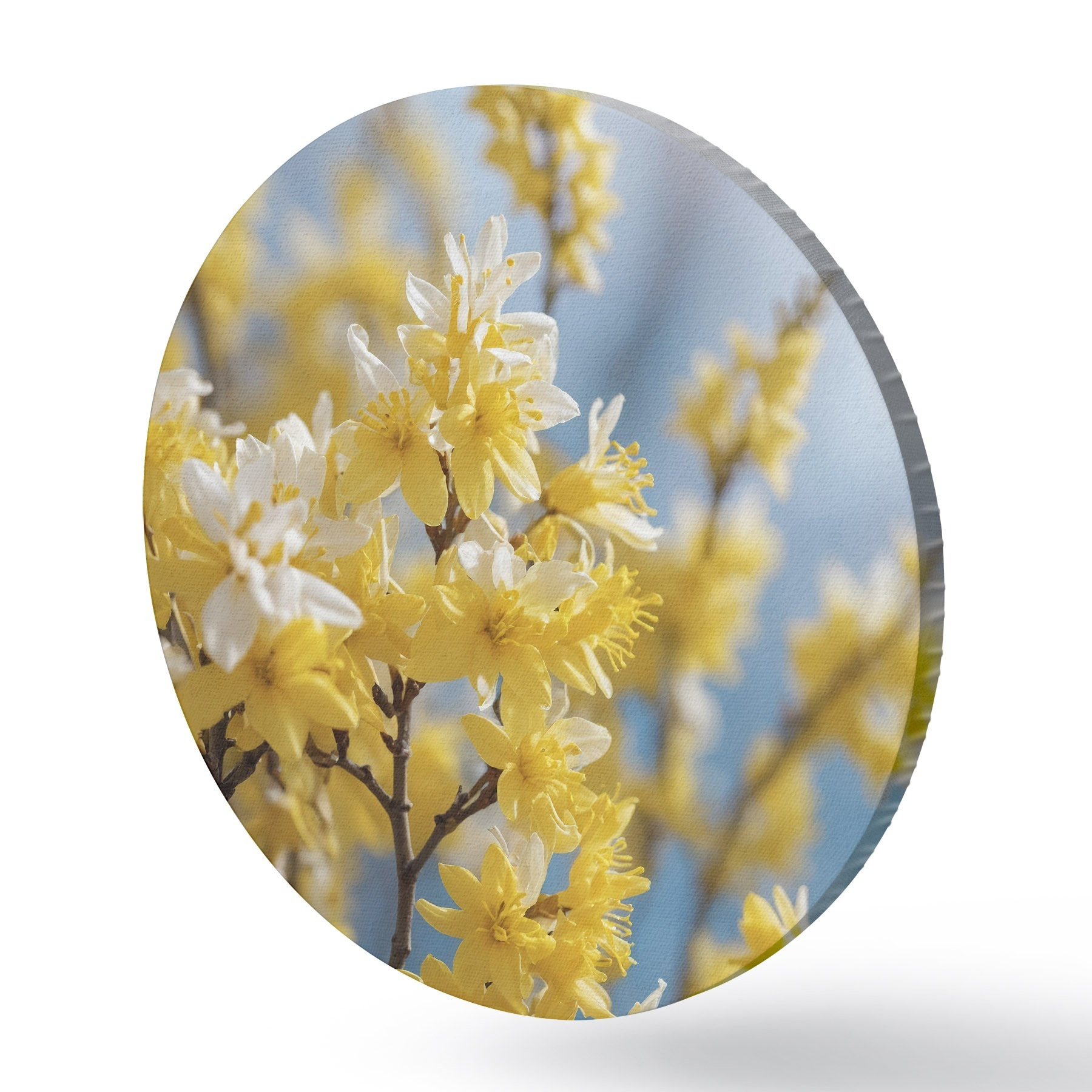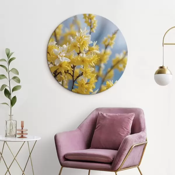 Quadri rotondi Fiori gialli su sfondo blu con messa a fuoco morbida r44894