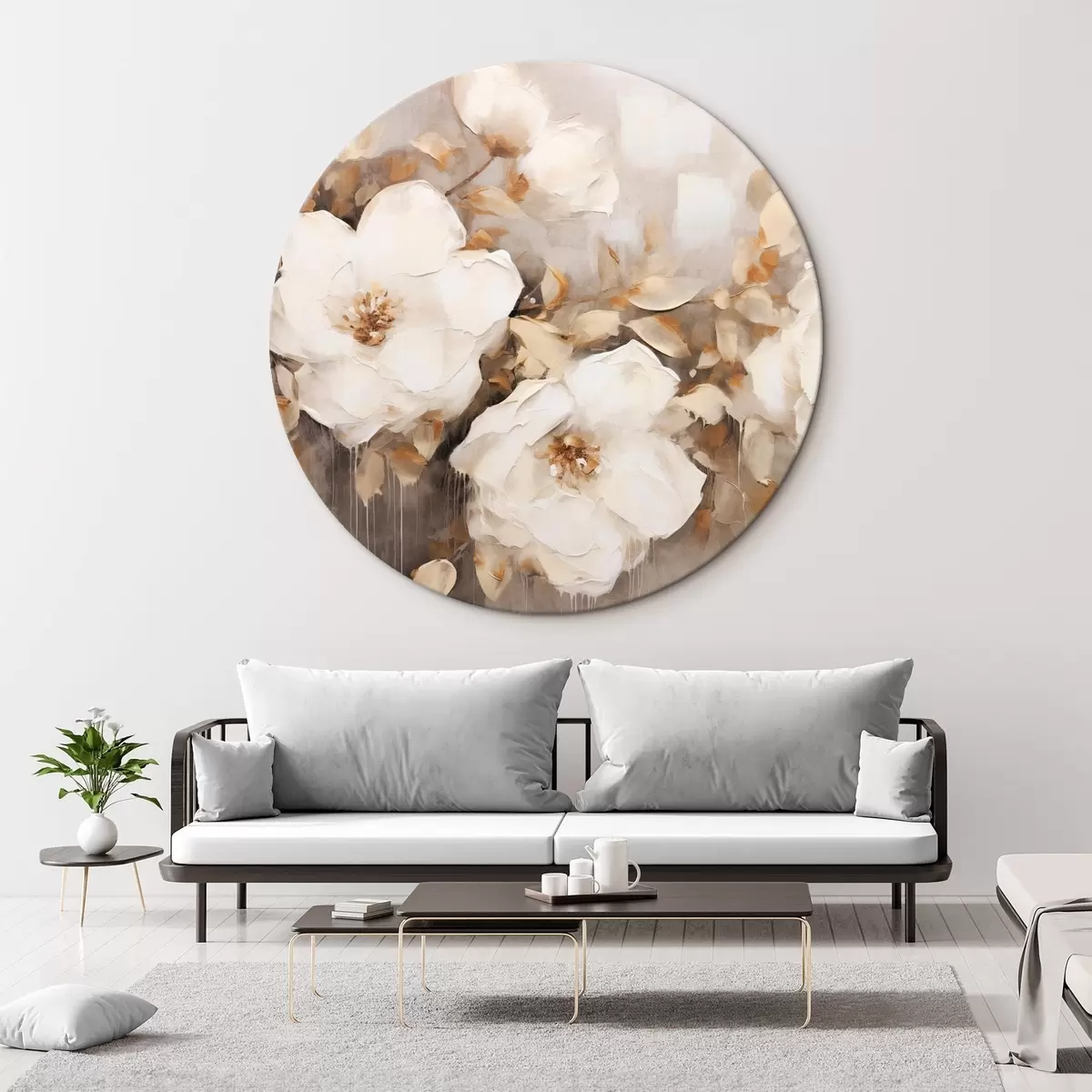 Quadri rotondi Fiori bianchi con foglie marroni su sfondo beige, imitazione di pittura a olio, composizione floreale, arte botanica r44922