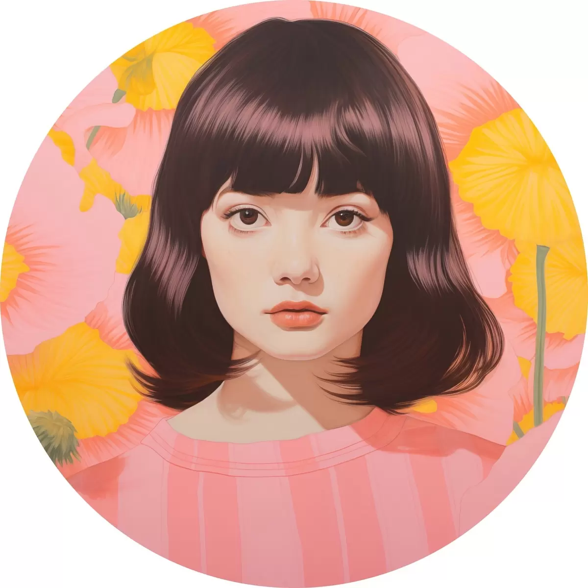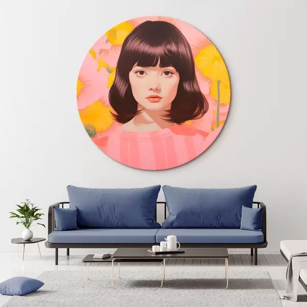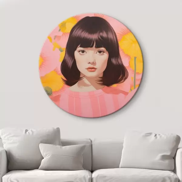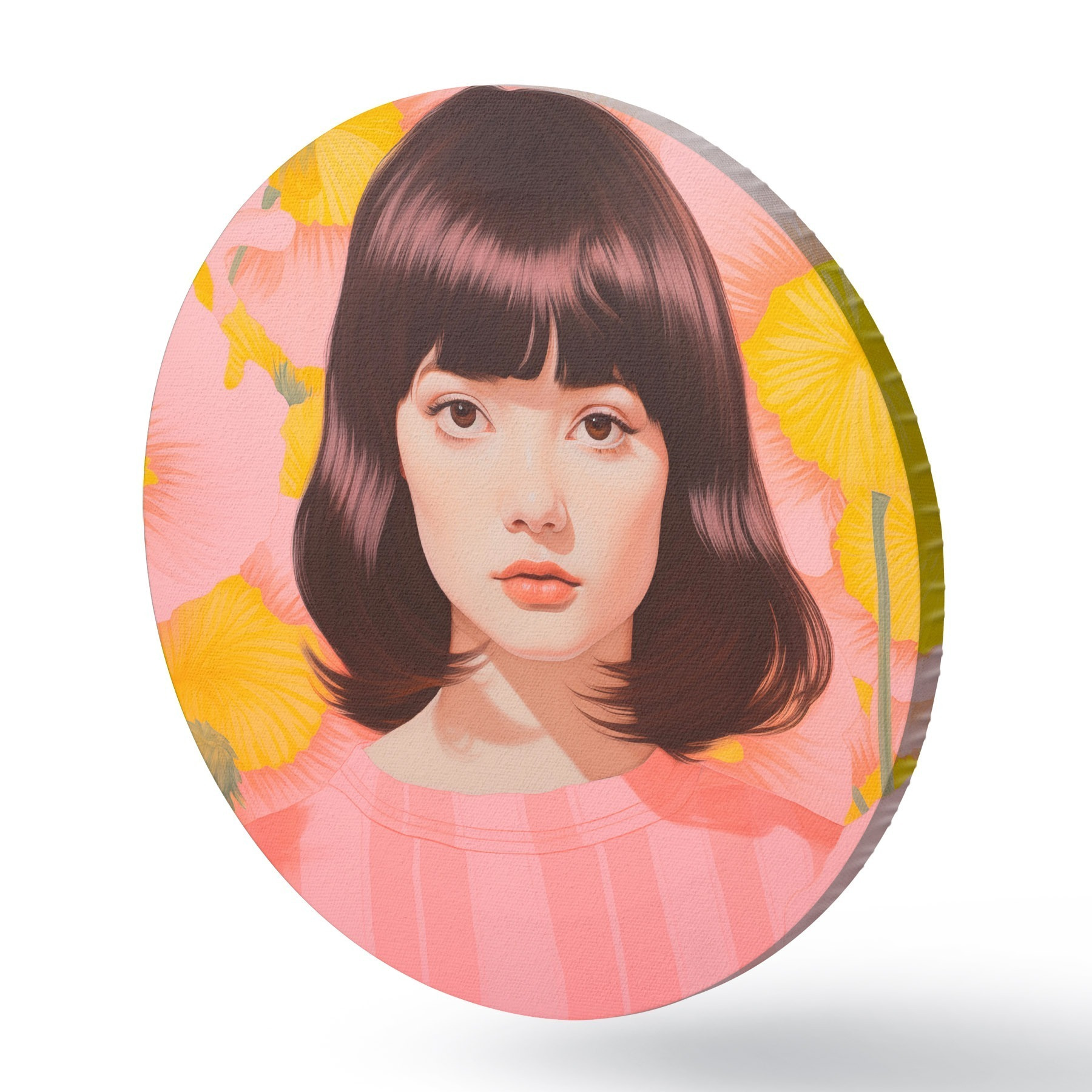 Quadri rotondi Un ritratto decorativo minimalista di ragazza asiatica in un campo di fiori gialli e rosa r44924