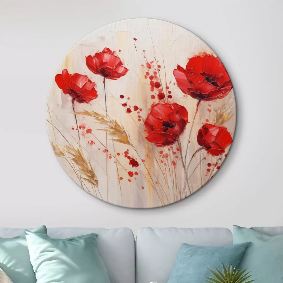 Quadri rotondi Fiori di papavero rossi con steli di grano gialli, su uno sfondo morbido e neutro con schizzi di vernice rossa r44926