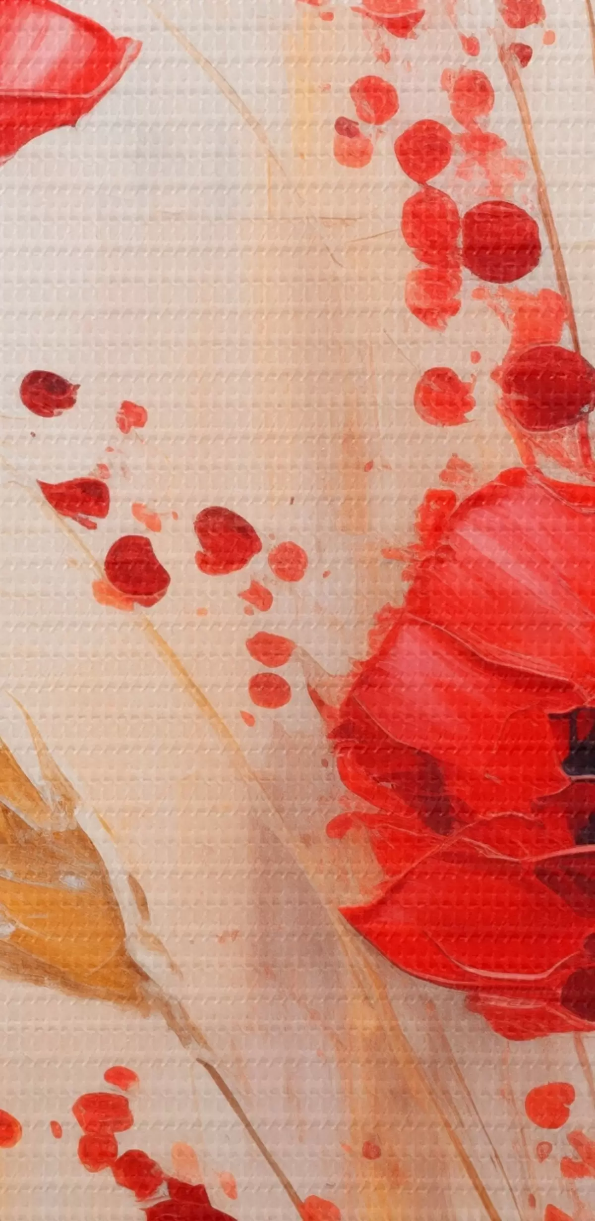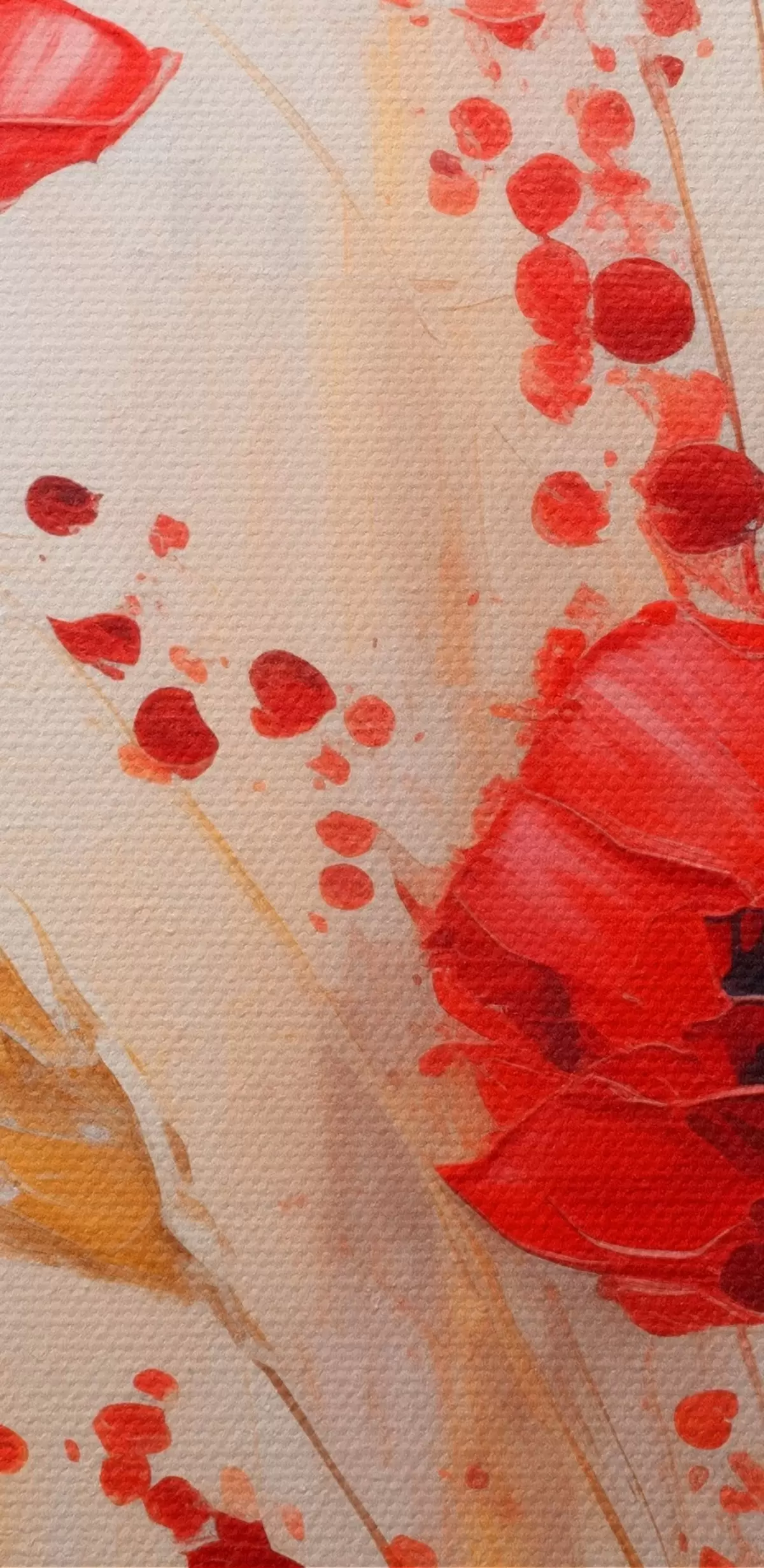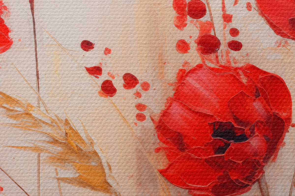 Immagine Fiori di papavero rossi con steli di grano gialli, su uno sfondo morbido e neutro con schizzi di vernice rossa Nr r44926