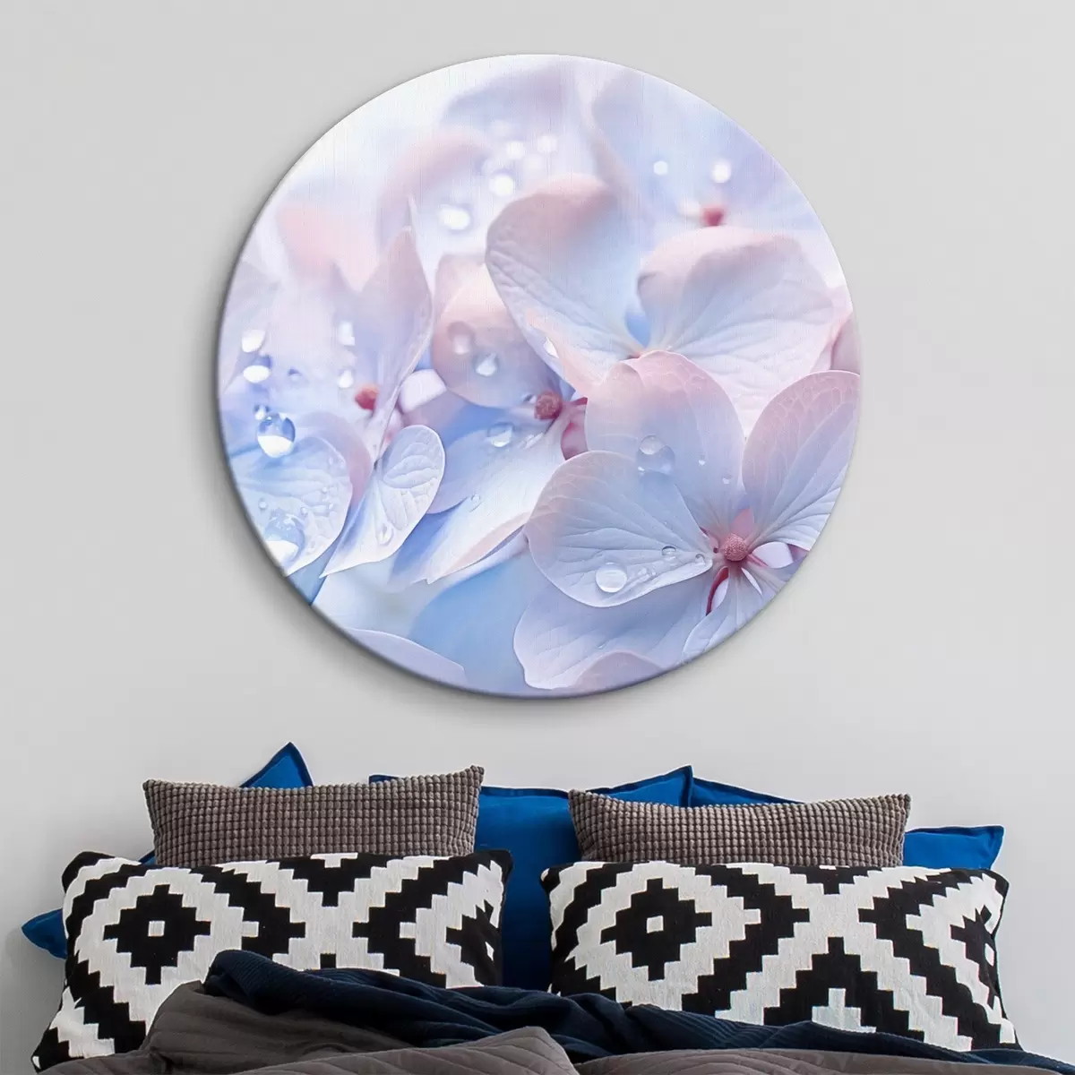 Quadri rotondi Fiori di ortensia con gocce d'acqua sui delicati petali, colori tenui e pastello, azzurro e rosa r44929