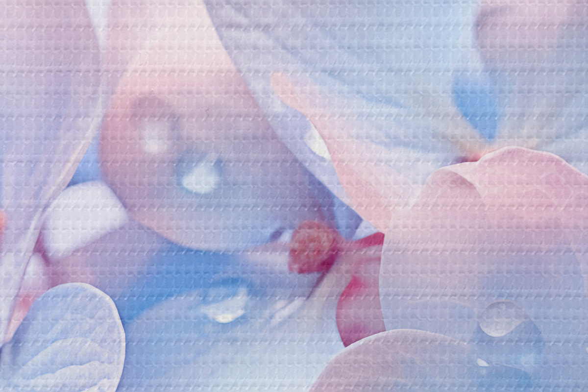 Immagine Fiori di ortensia con gocce d'acqua sui delicati petali, colori tenui e pastello, azzurro e rosa Nr r44929