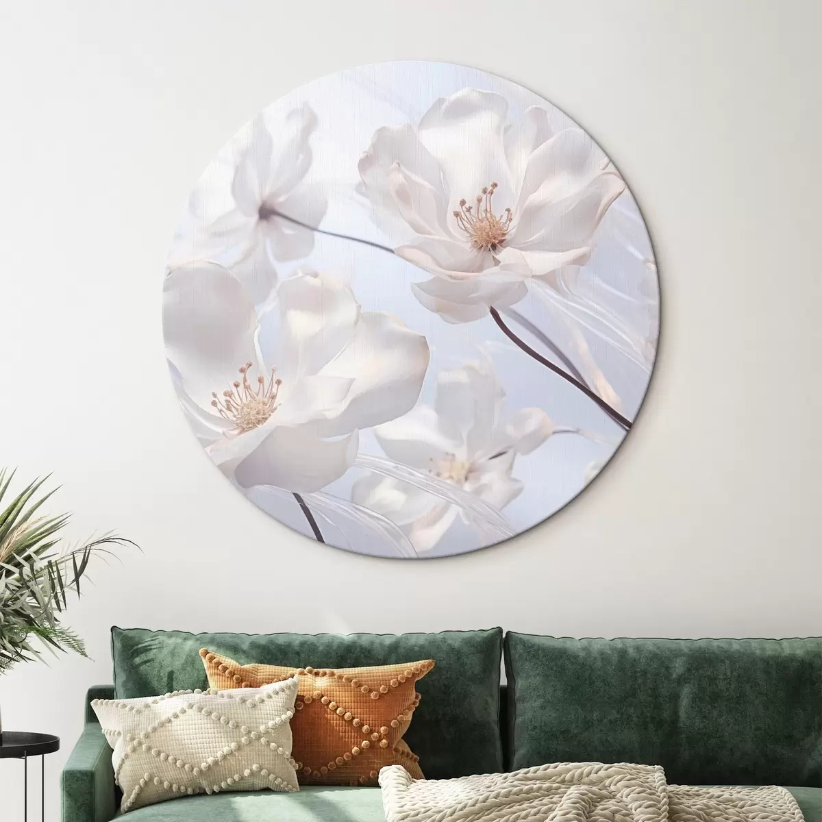 Quadri rotondi Fiori bianchi con petali traslucidi, sfondo azzurro tenue, elegante, romantico, delicato, sognante r44931