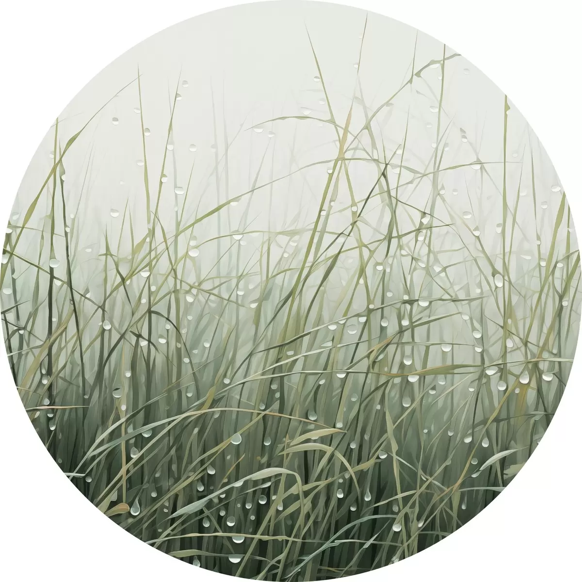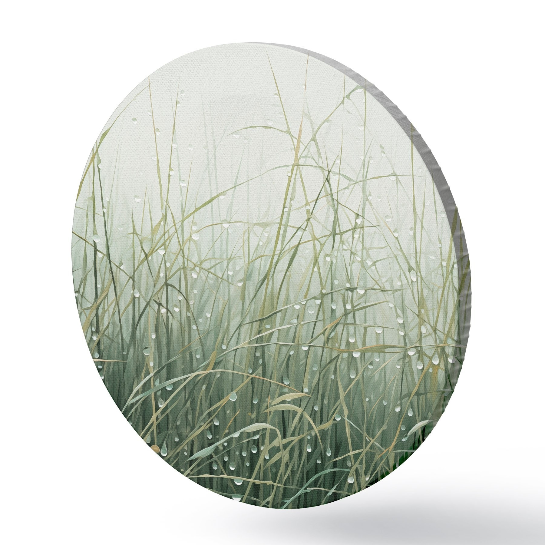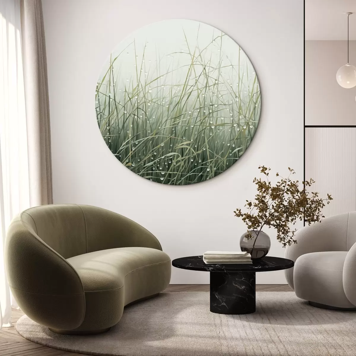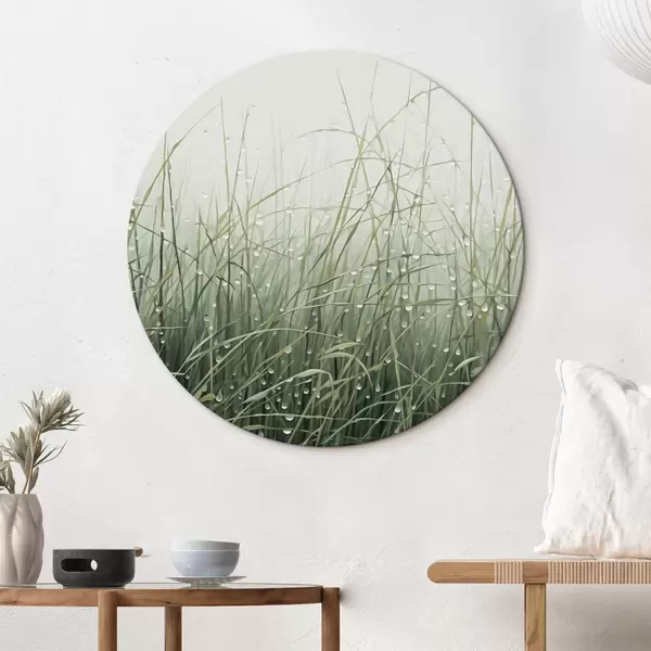 Quadri rotondi Erba con gocce d'acqua, sfumature verdi, luce soffusa, sfondo nebbioso, stile astratto minimalista con texture r44932
