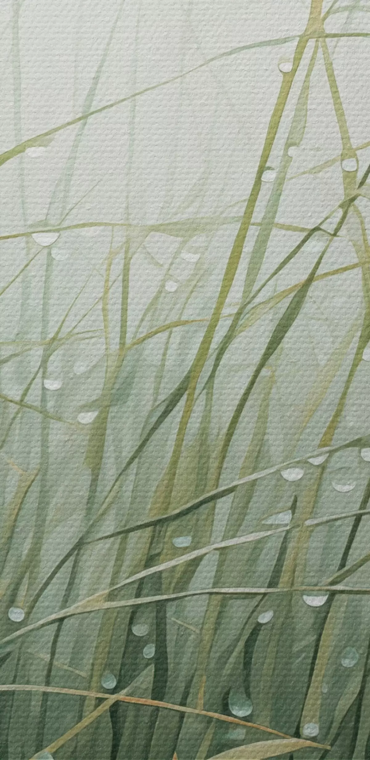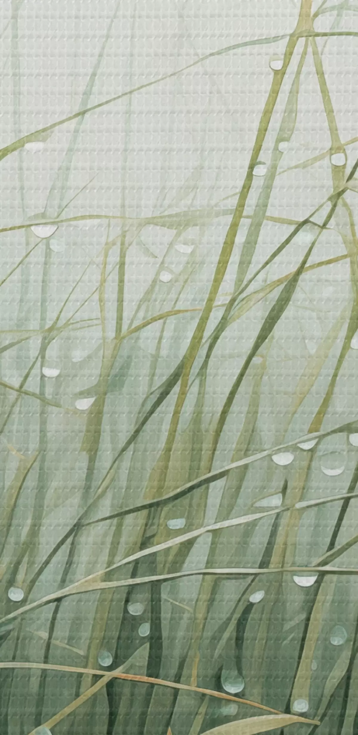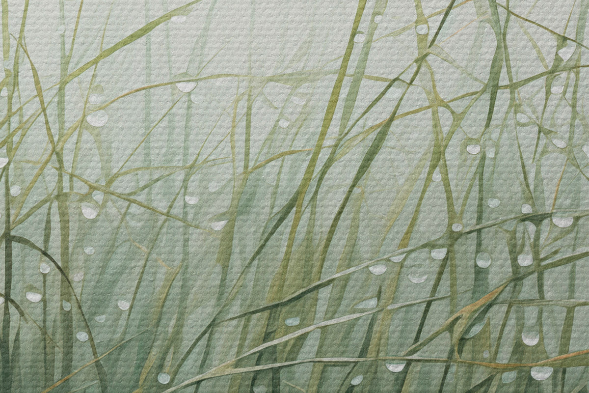 Immagine Erba con gocce d'acqua, sfumature verdi, luce soffusa, sfondo nebbioso, stile astratto minimalista con texture Nr r44932