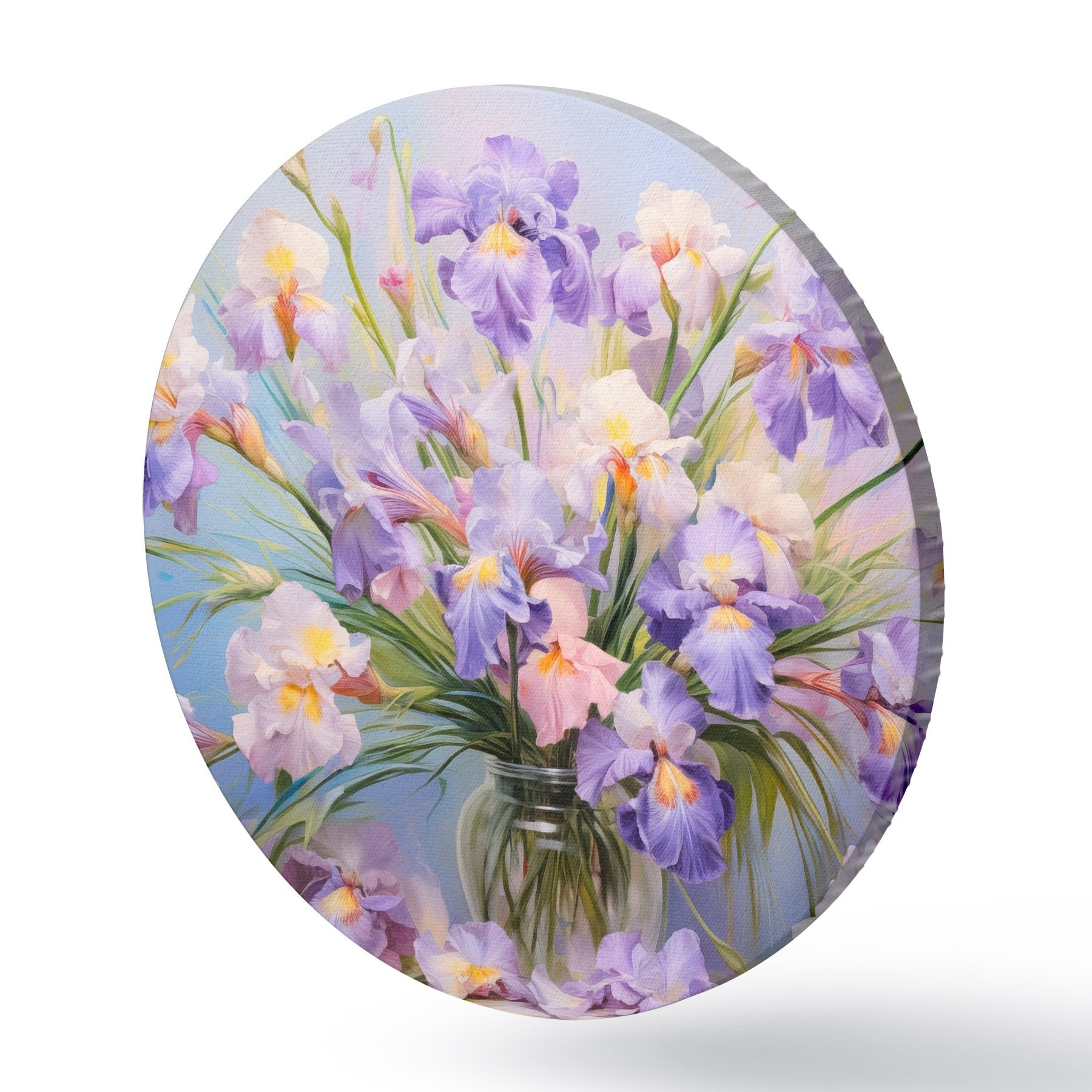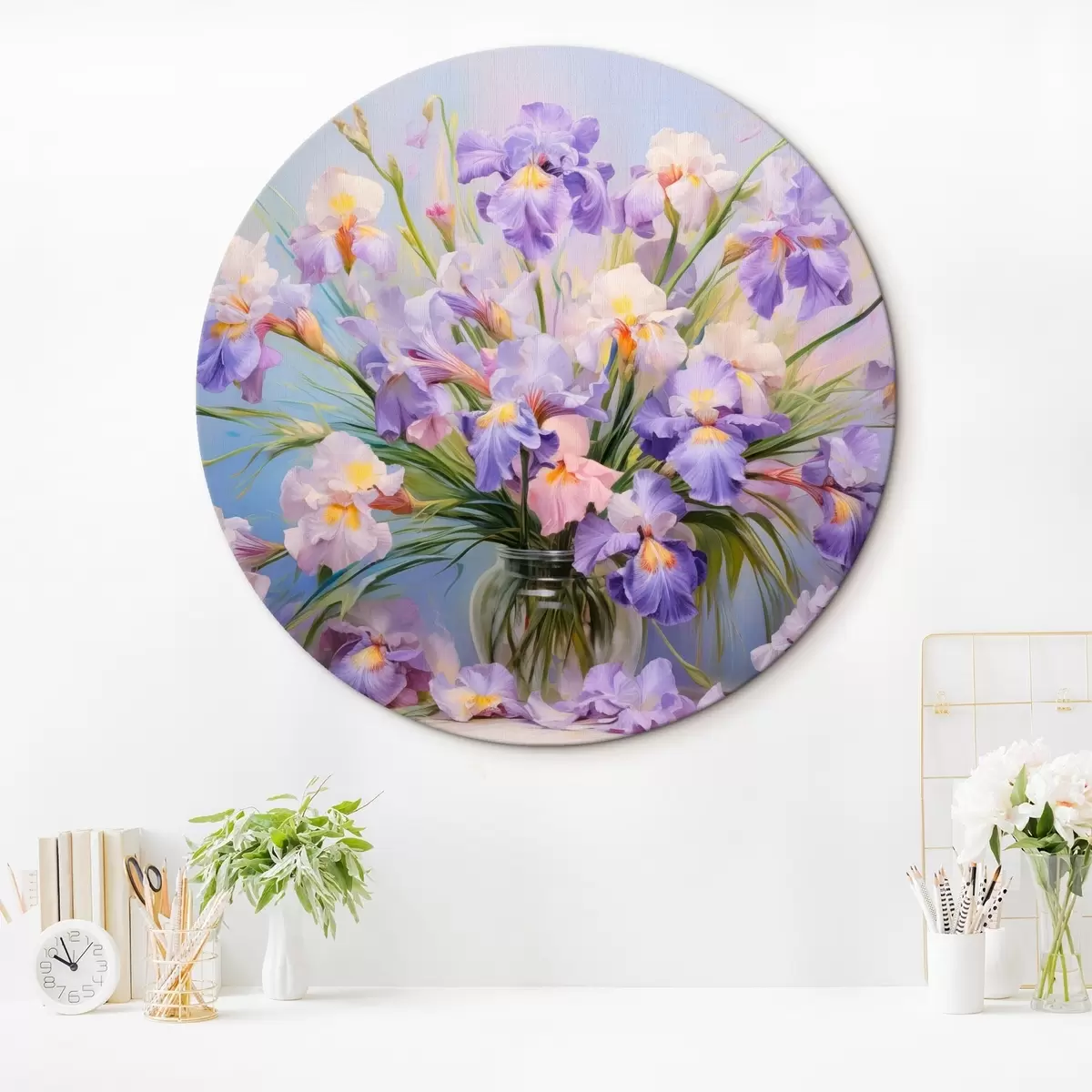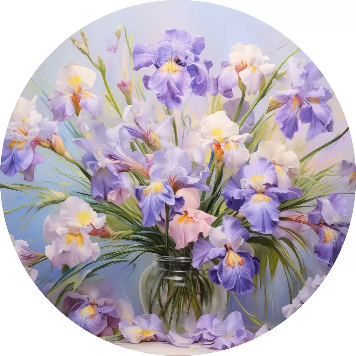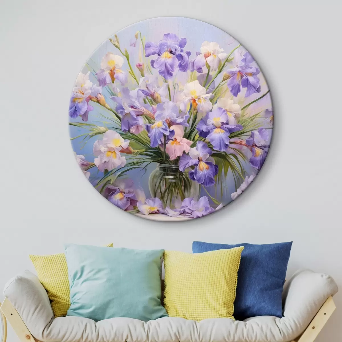 Quadri rotondi Un vaso con molti iris pastello, alcuni petali sparsi sul tavolo, uno sfondo pastello dai toni blu e rosa r44933