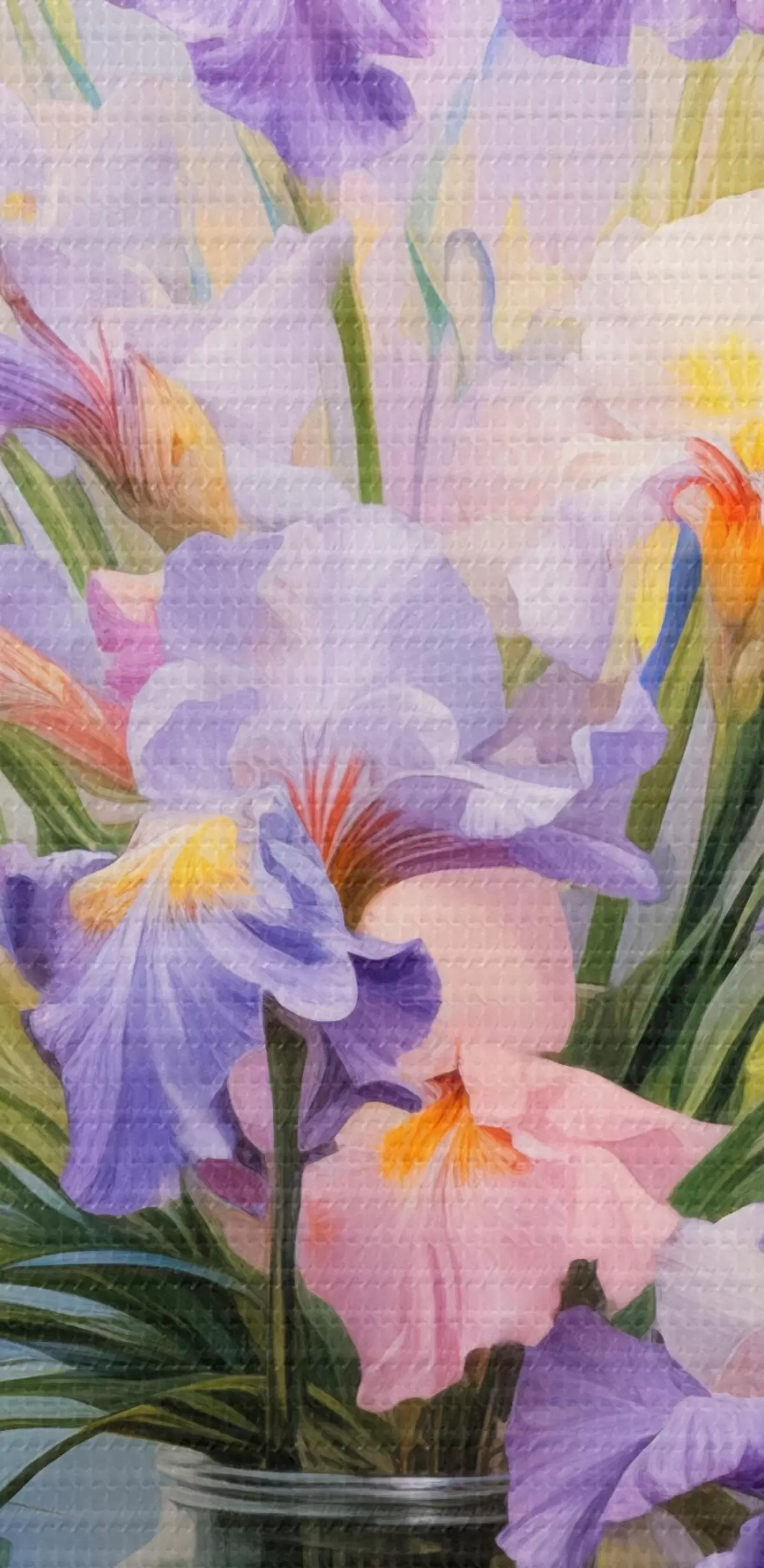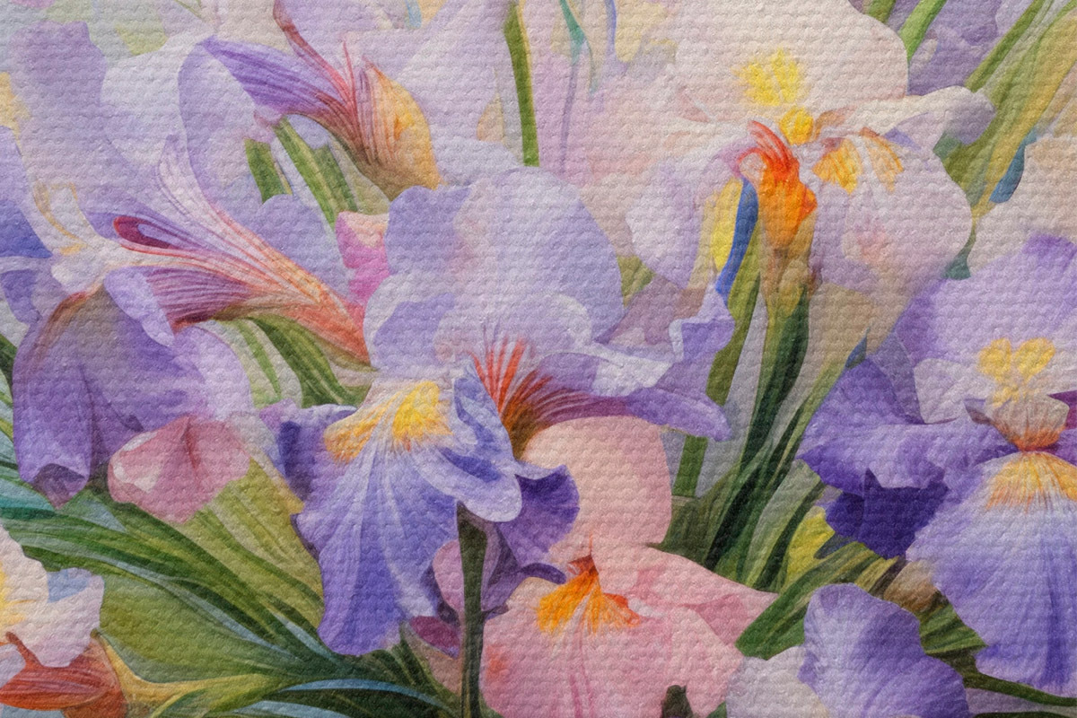 Immagine Un vaso con molti iris pastello, alcuni petali sparsi sul tavolo, uno sfondo pastello dai toni blu e rosa Nr r44933