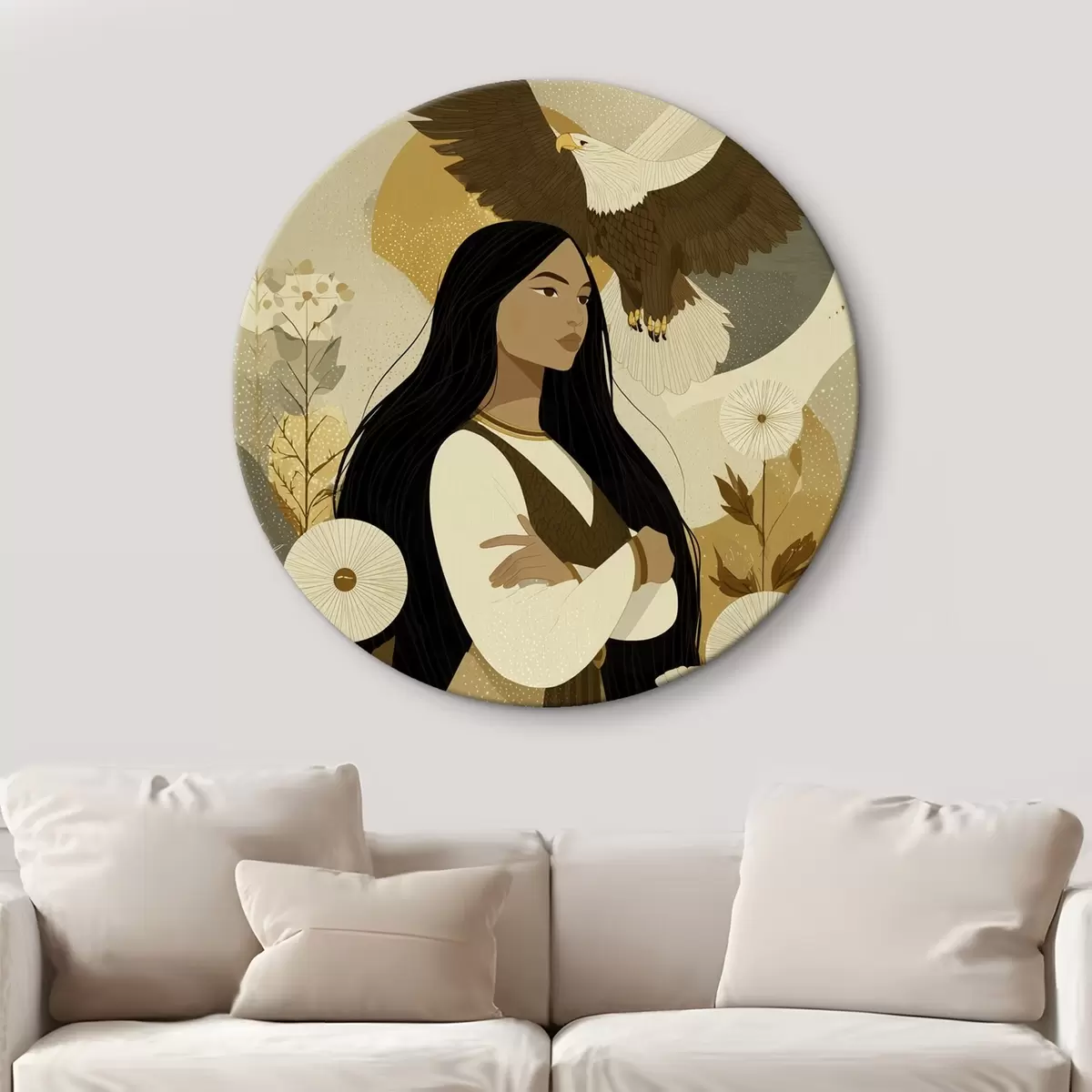 Quadri rotondi Donna con aquila in volo, stile tribale, colori beige r44977