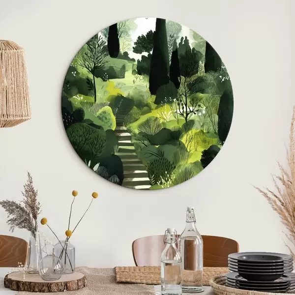 Quadri rotondi Colline verdi con alberi e cespugli, scale in cemento, colori lussureggianti r44980
