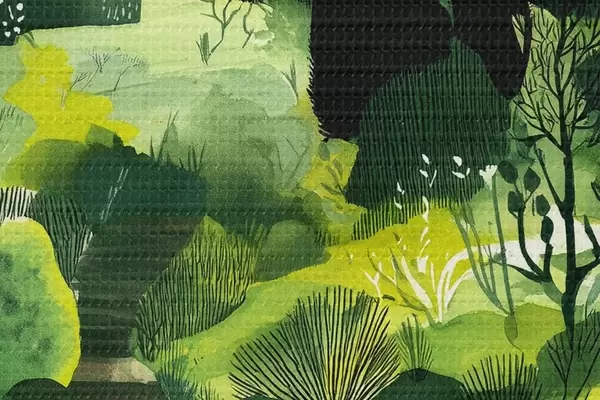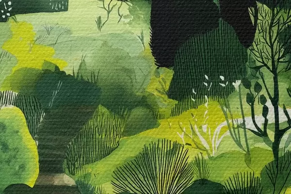 Immagine Colline verdi con alberi e cespugli, scale in cemento, colori lussureggianti Nr r44980
