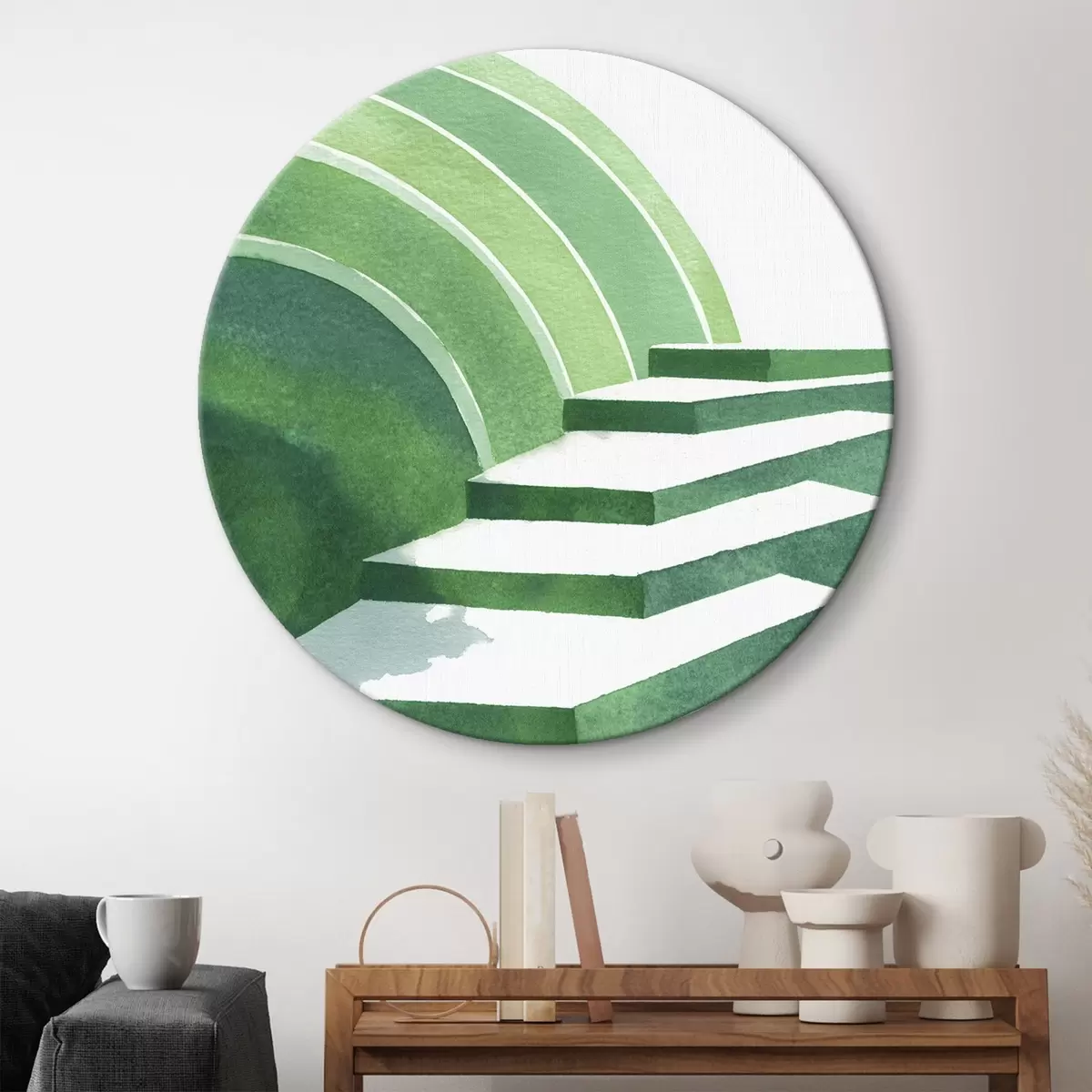 Quadri rotondi Astrazione geometrica in colori verdi, stile acquerello r44981