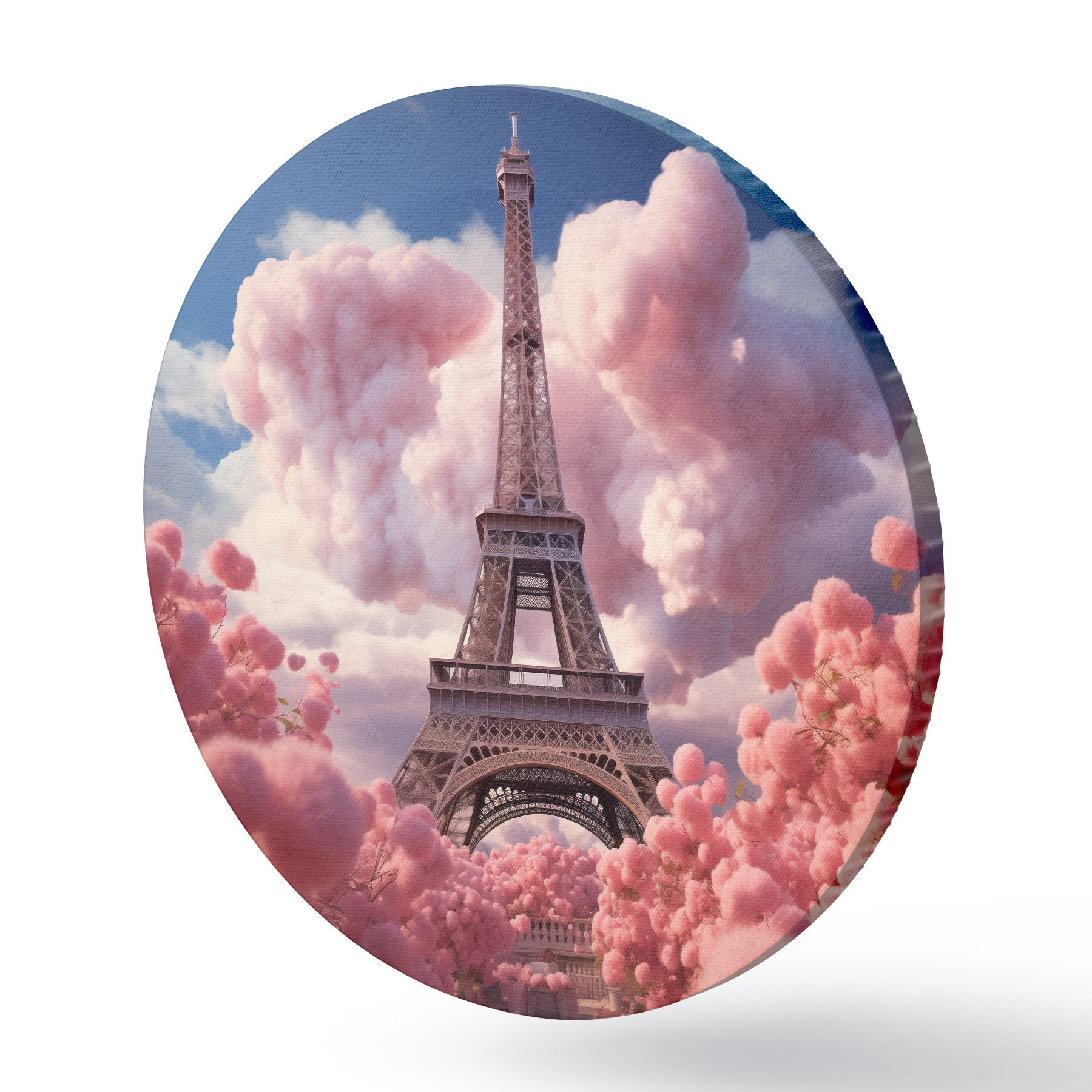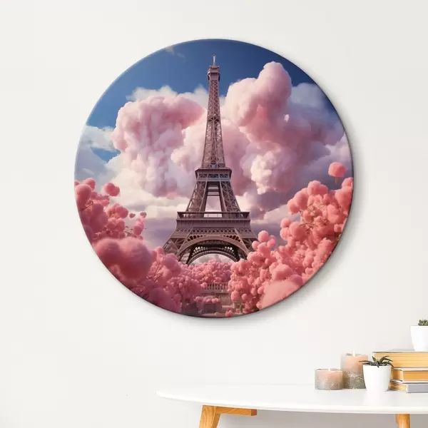 Quadri rotondi Torre Eiffel tra le nuvole rosa in stile fantasy r45036
