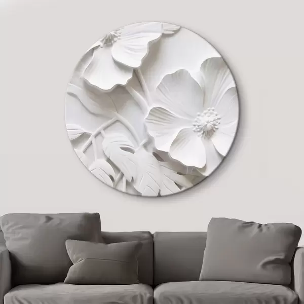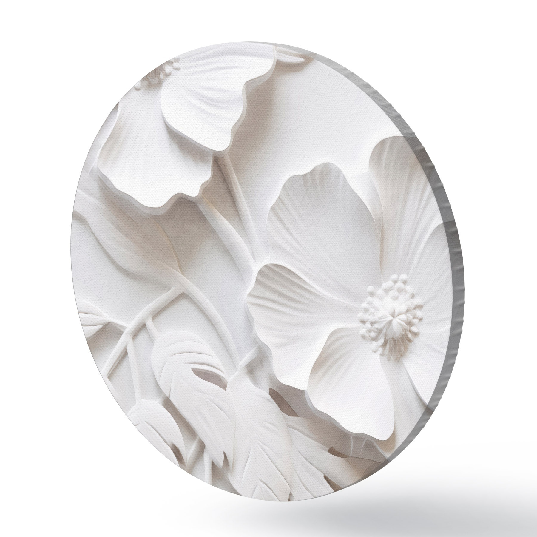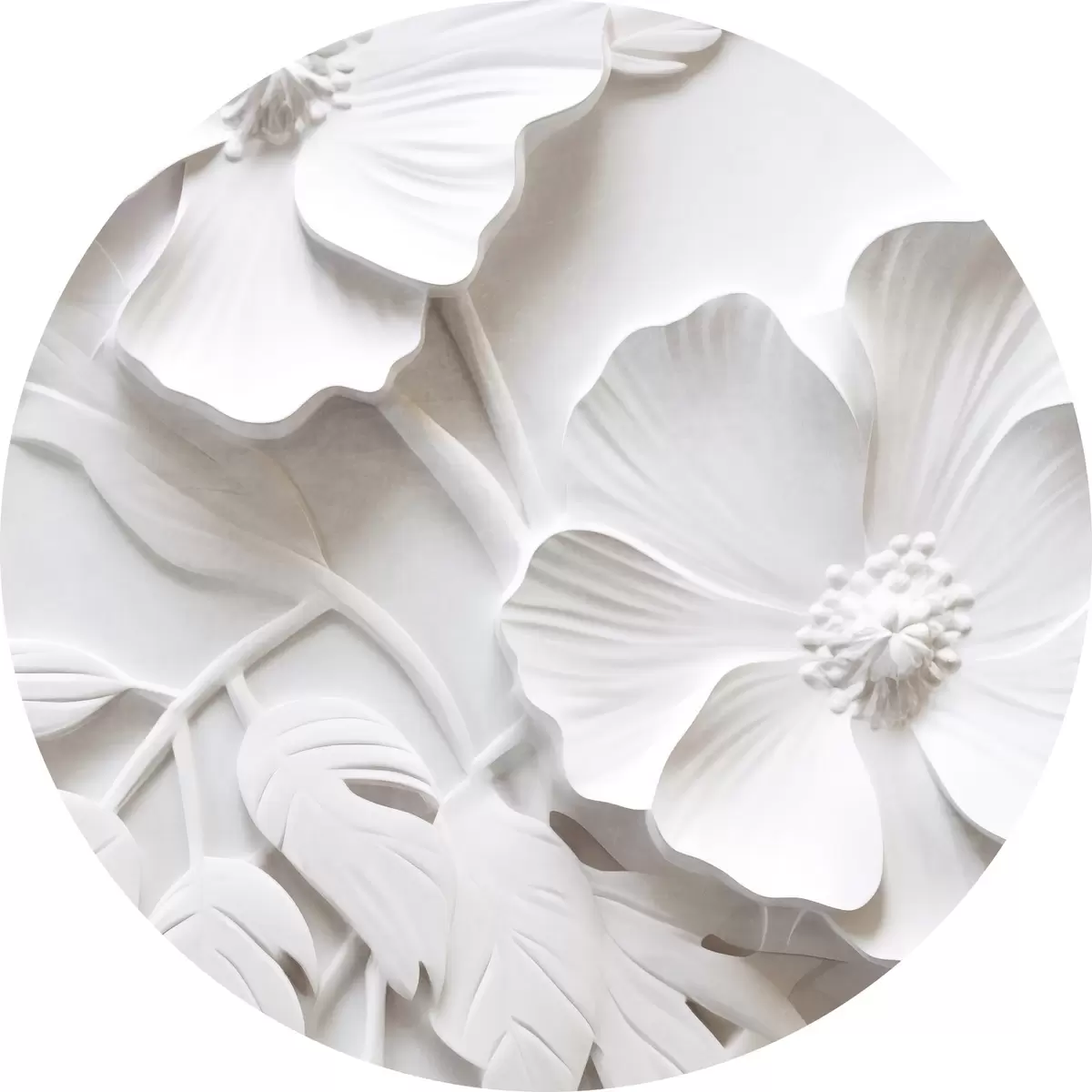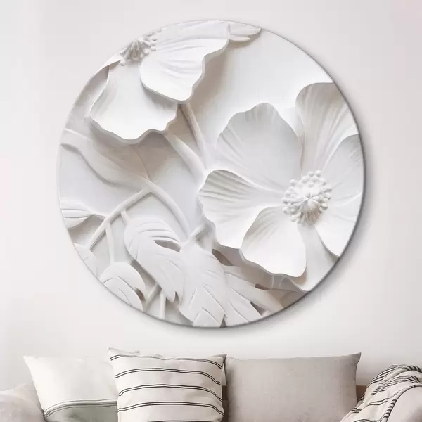 Quadri rotondi Fiori bianchi minimalisti decorativi con foglie, imitazione in rilievo, sfondo bianco r45179