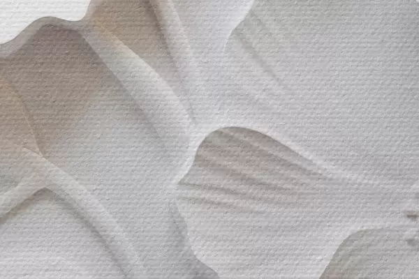 Immagine Fiori bianchi minimalisti decorativi con foglie, imitazione in rilievo, sfondo bianco Nr r45179