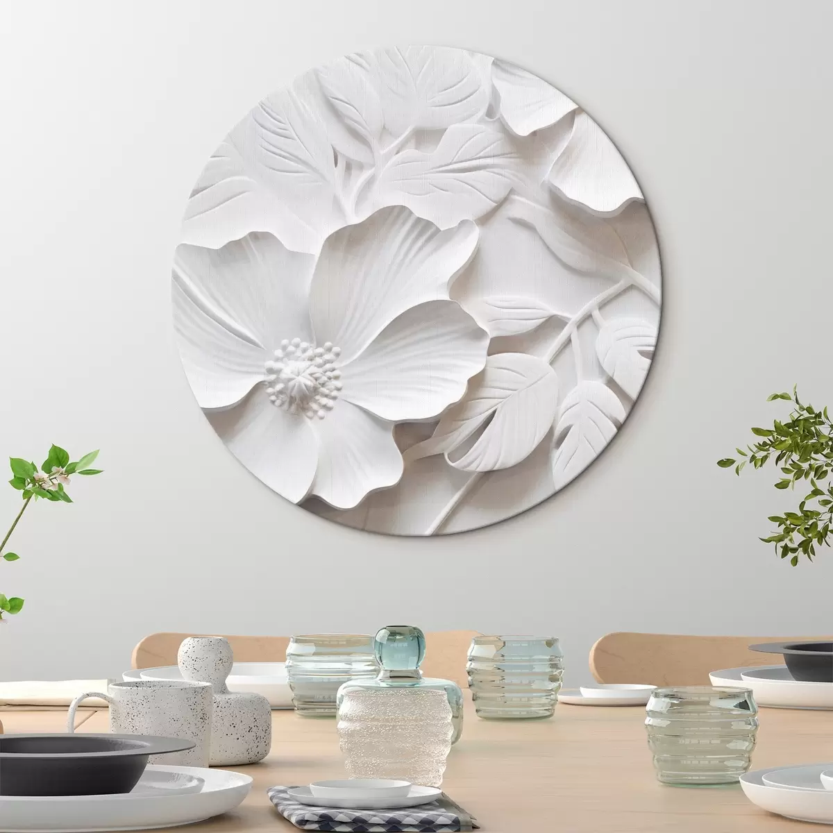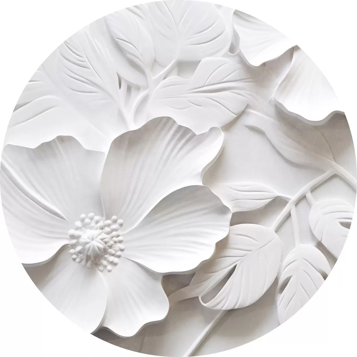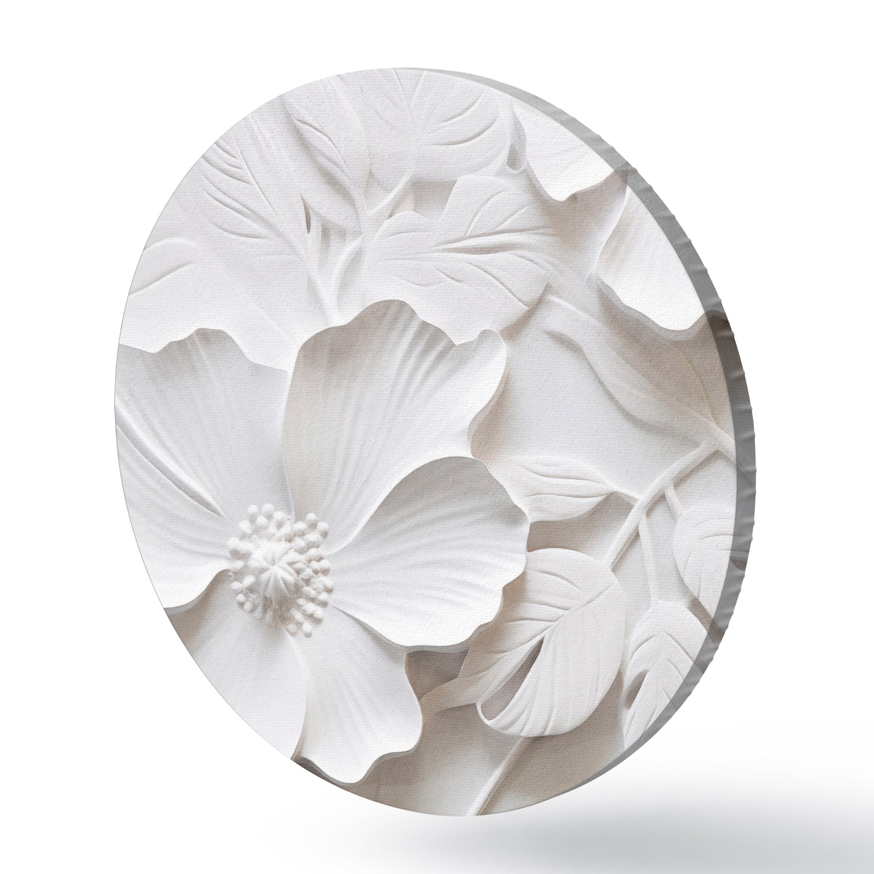 Quadri rotondi Fiori bianchi minimalisti decorativi con foglie, imitazione in rilievo, sfondo bianco r45180