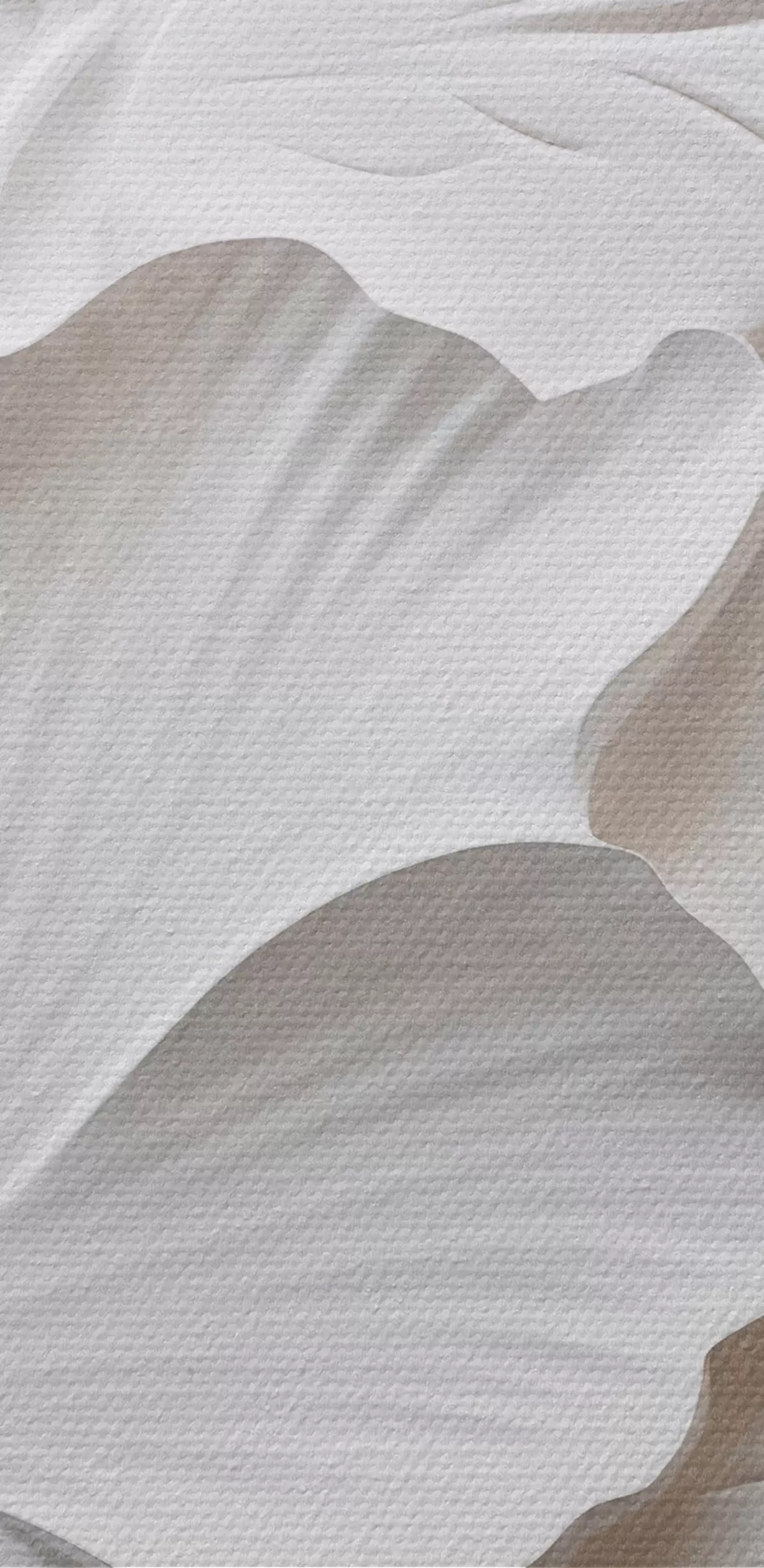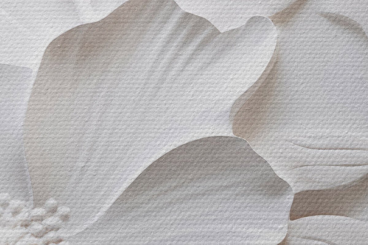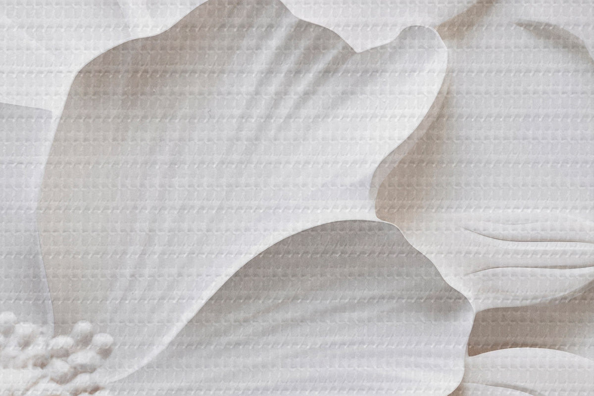 Immagine Fiori bianchi minimalisti decorativi con foglie, imitazione in rilievo, sfondo bianco Nr r45180
