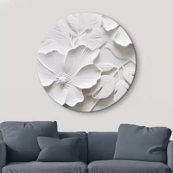 Quadri rotondi Fiori bianchi minimalisti decorativi con foglie, imitazione in rilievo, sfondo bianco r45180
