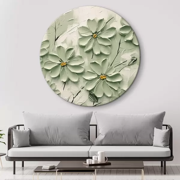 Quadri rotondi Fiori verdi con centro giallo dipinti con pennellate spesse su sfondo chiaro r45265