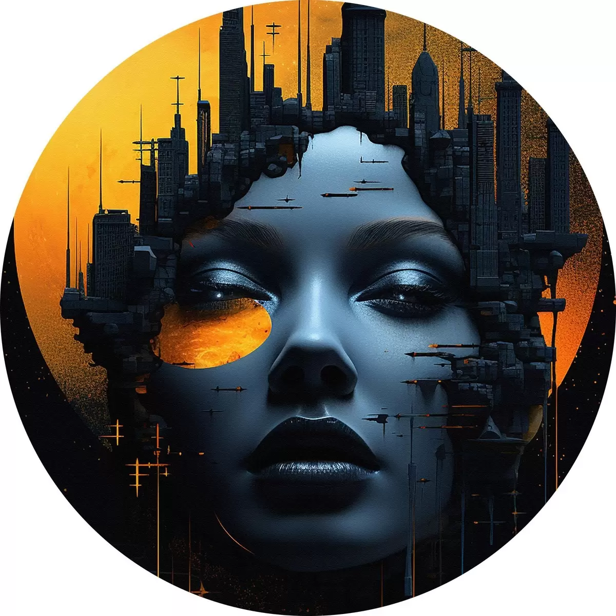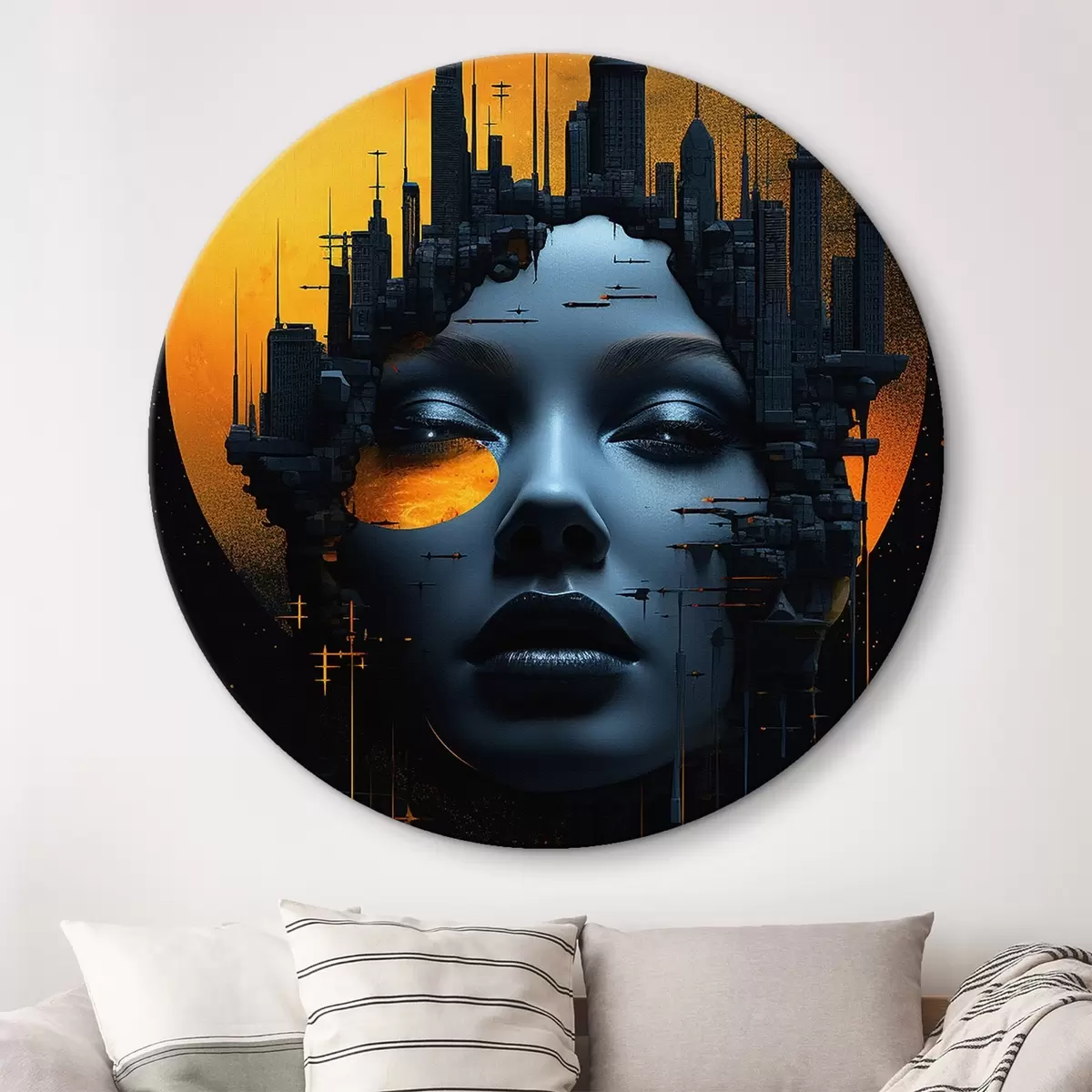 Quadri rotondi Persone, volto di ragazza su sfondo cittadino, astratto r45341