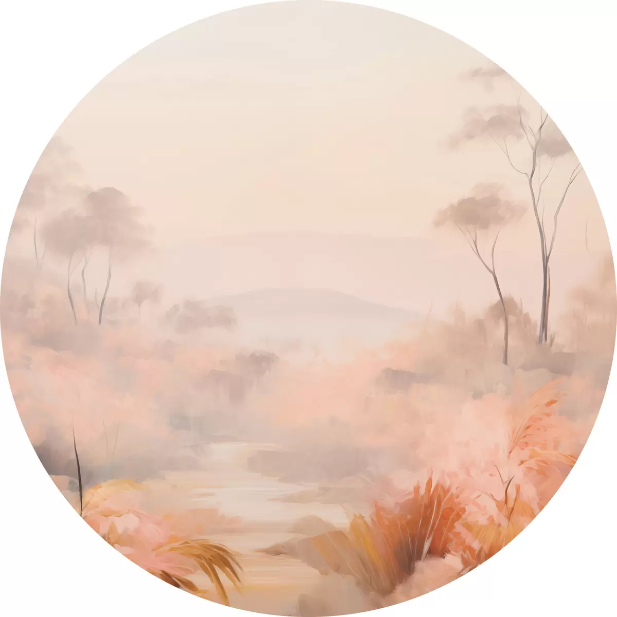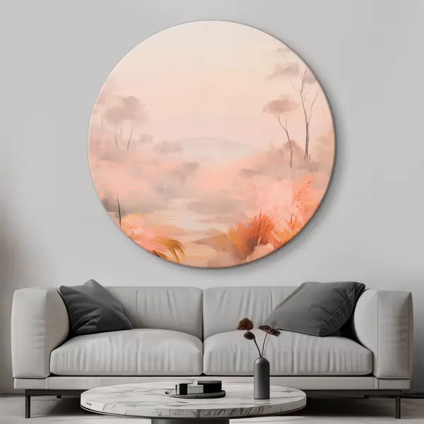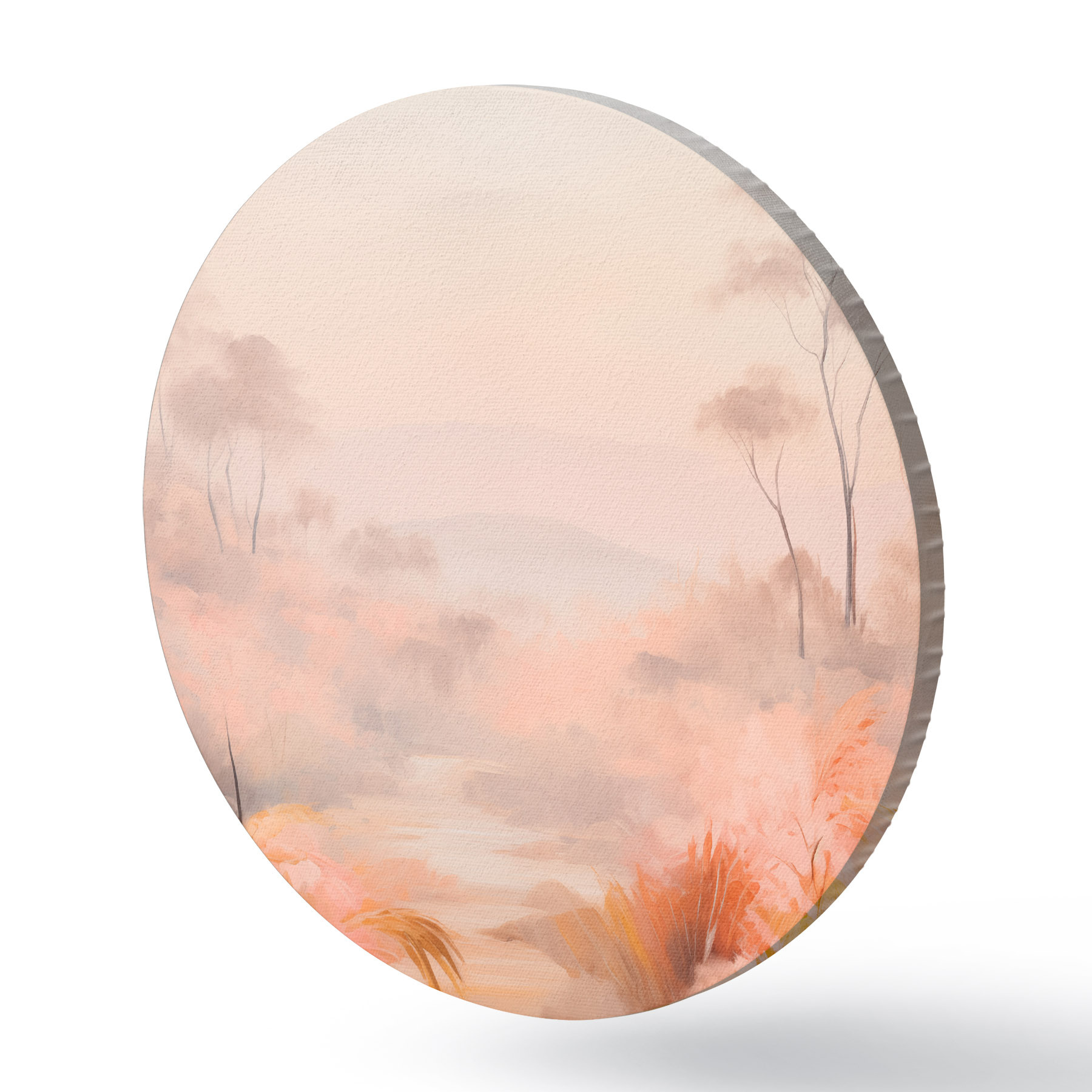 Quadri rotondi Un paesaggio con cespugli e alberi nei toni del rosa, dell'arancio e del marrone, con le montagne sullo sfondo r45553