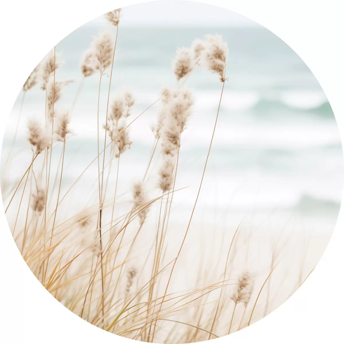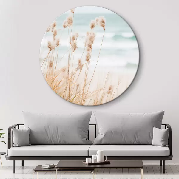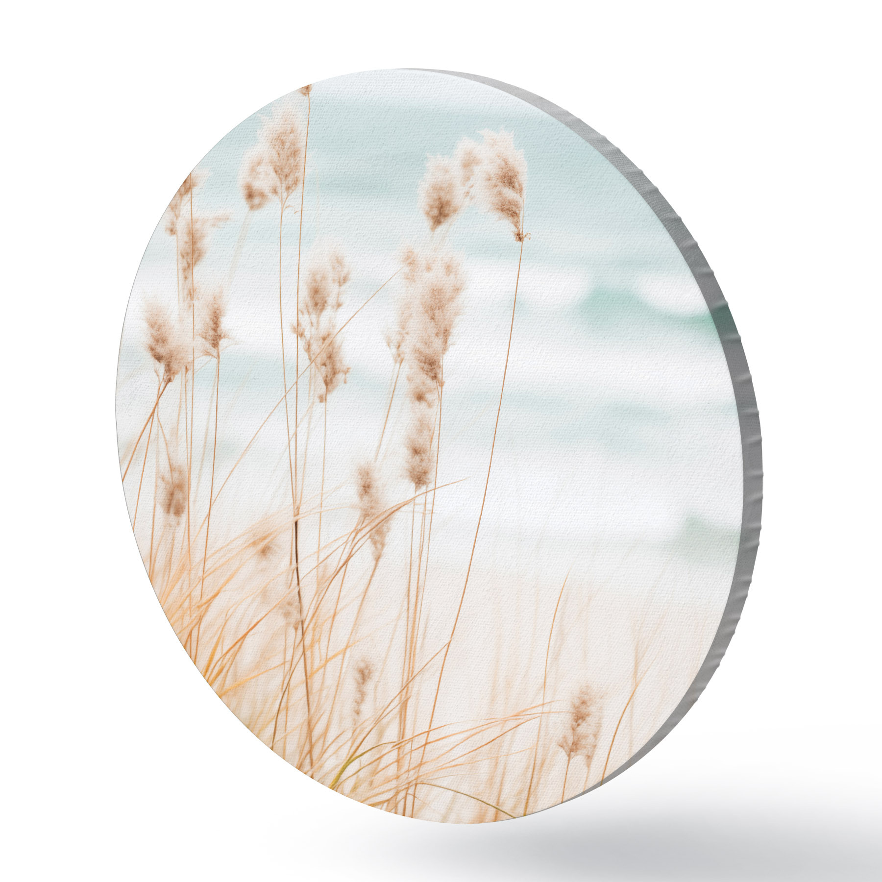 Quadri rotondi Erba alta con teste di semi soffici, spiaggia sabbiosa e onde dell'oceano sullo sfondo, tavolozza di colori tenui e smorzati r45561