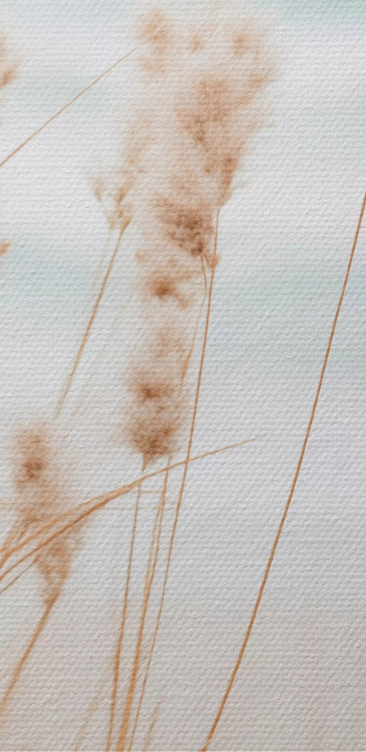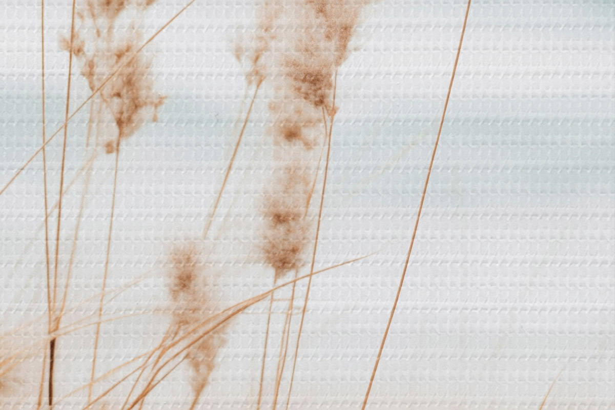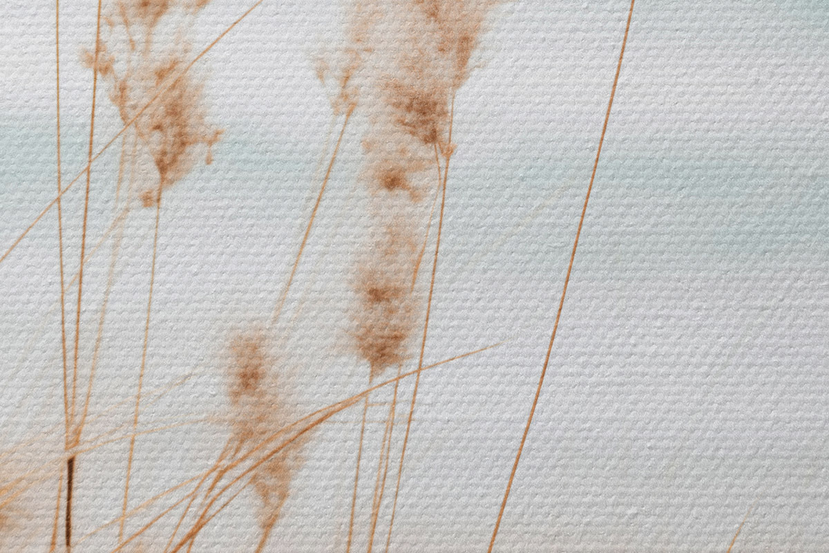 Immagine Erba alta con teste di semi soffici, spiaggia sabbiosa e onde dell'oceano sullo sfondo, tavolozza di colori tenui e smorzati Nr r45561