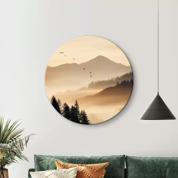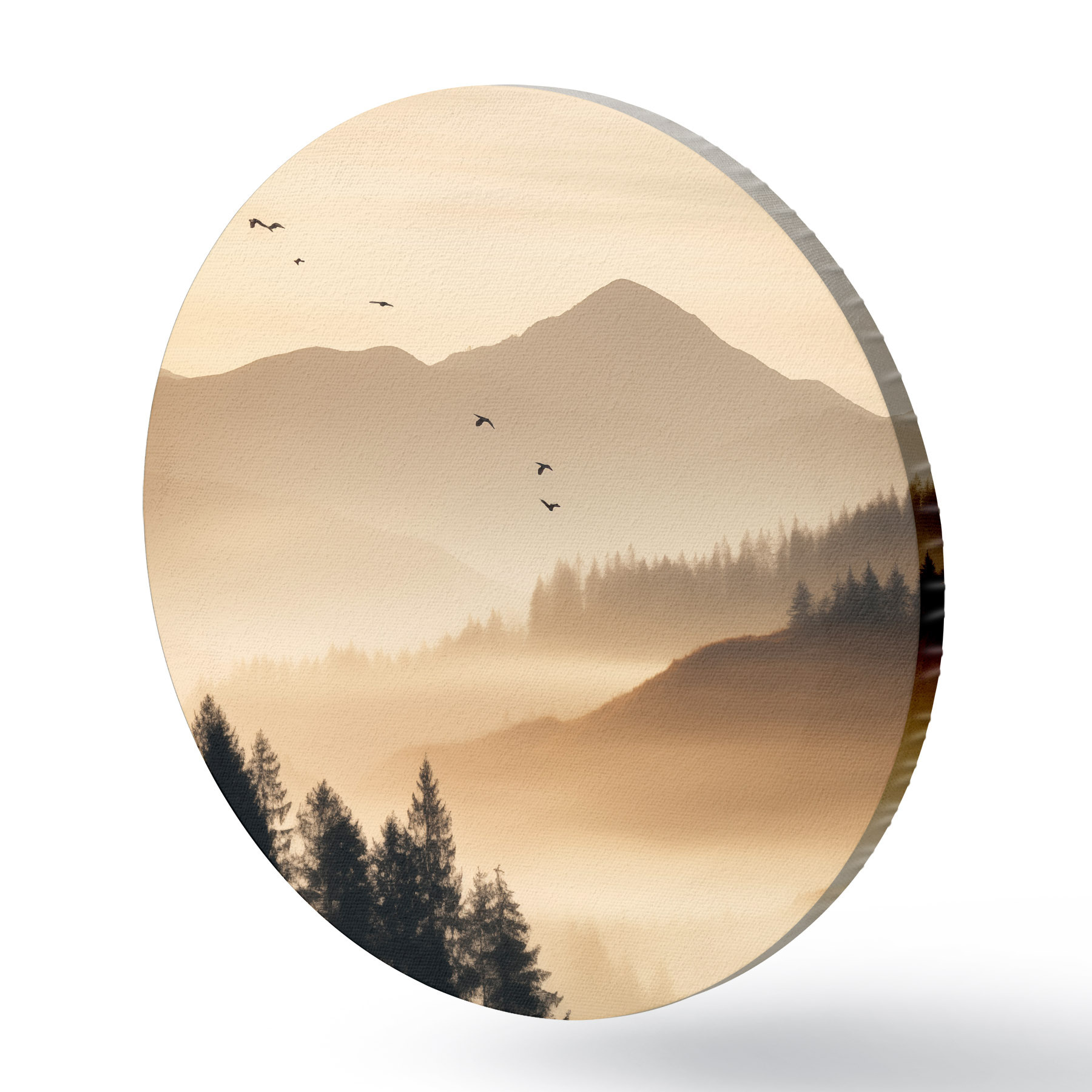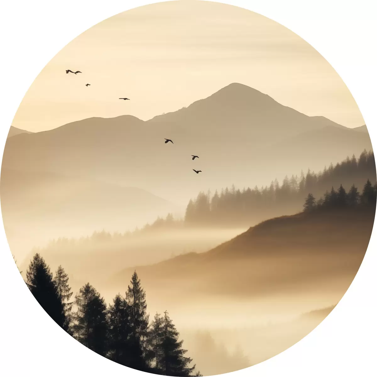 Quadri rotondi Un paesaggio montano con una foresta e uccelli che volano nel cielo, il tutto coperto da uno spesso strato di nebbia durante l'alba r45563