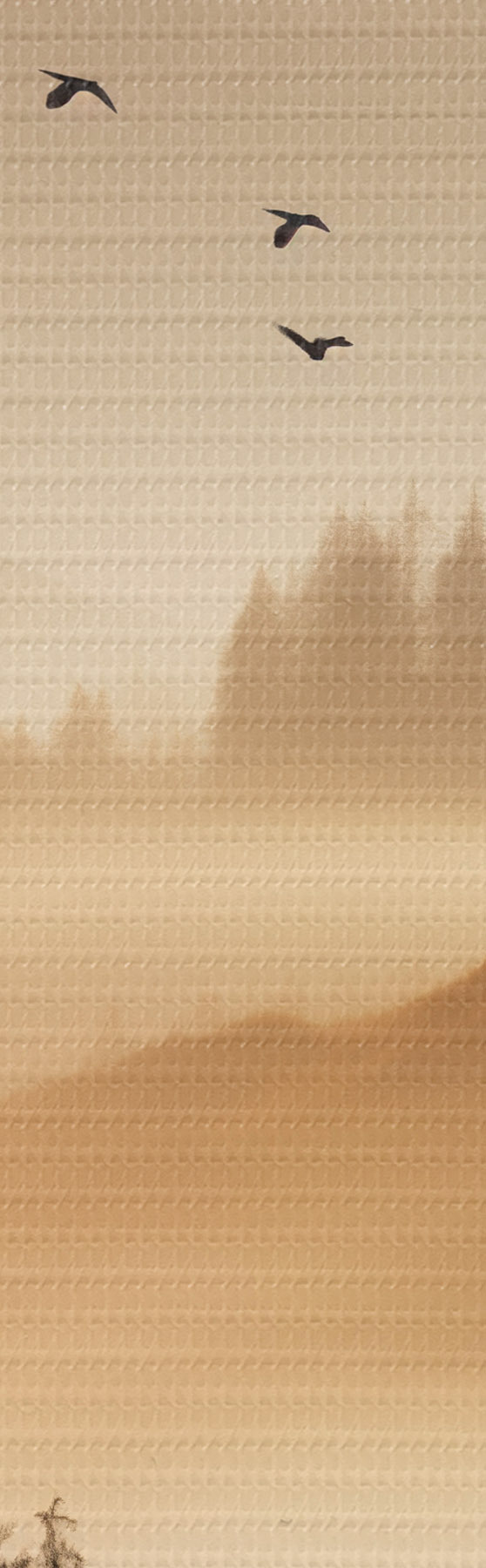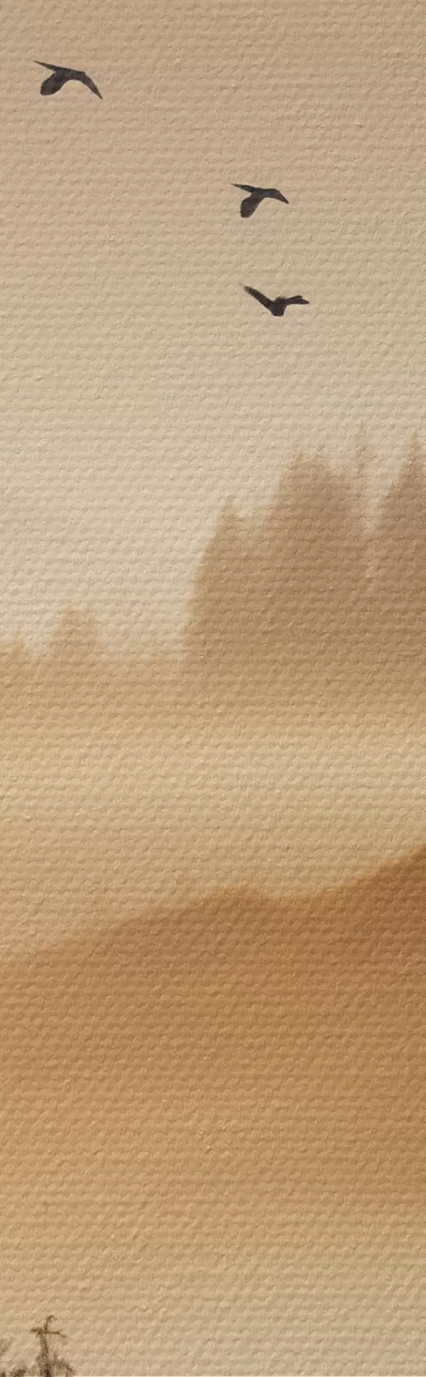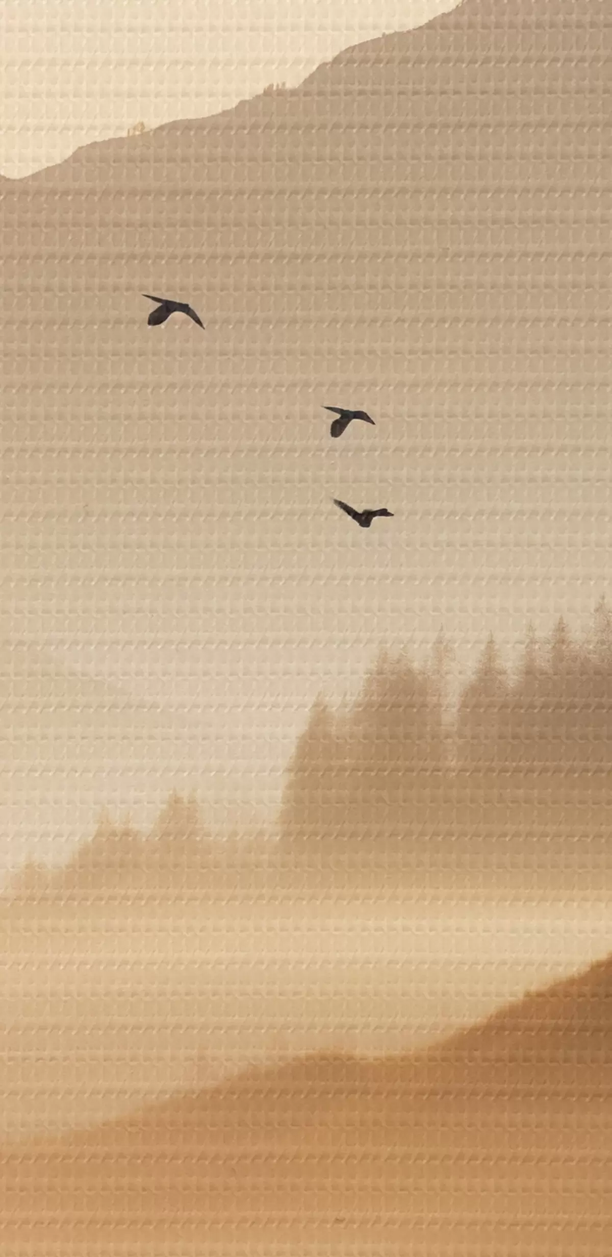 Immagine Un paesaggio montano con una foresta e uccelli che volano nel cielo, il tutto coperto da uno spesso strato di nebbia durante l'alba Nr r45563