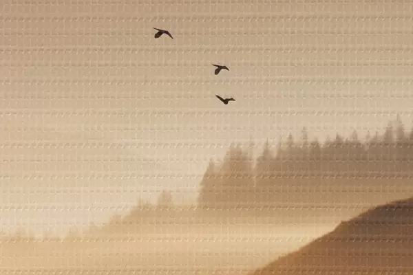 Immagine Un paesaggio montano con una foresta e uccelli che volano nel cielo, il tutto coperto da uno spesso strato di nebbia durante l'alba Nr r45563