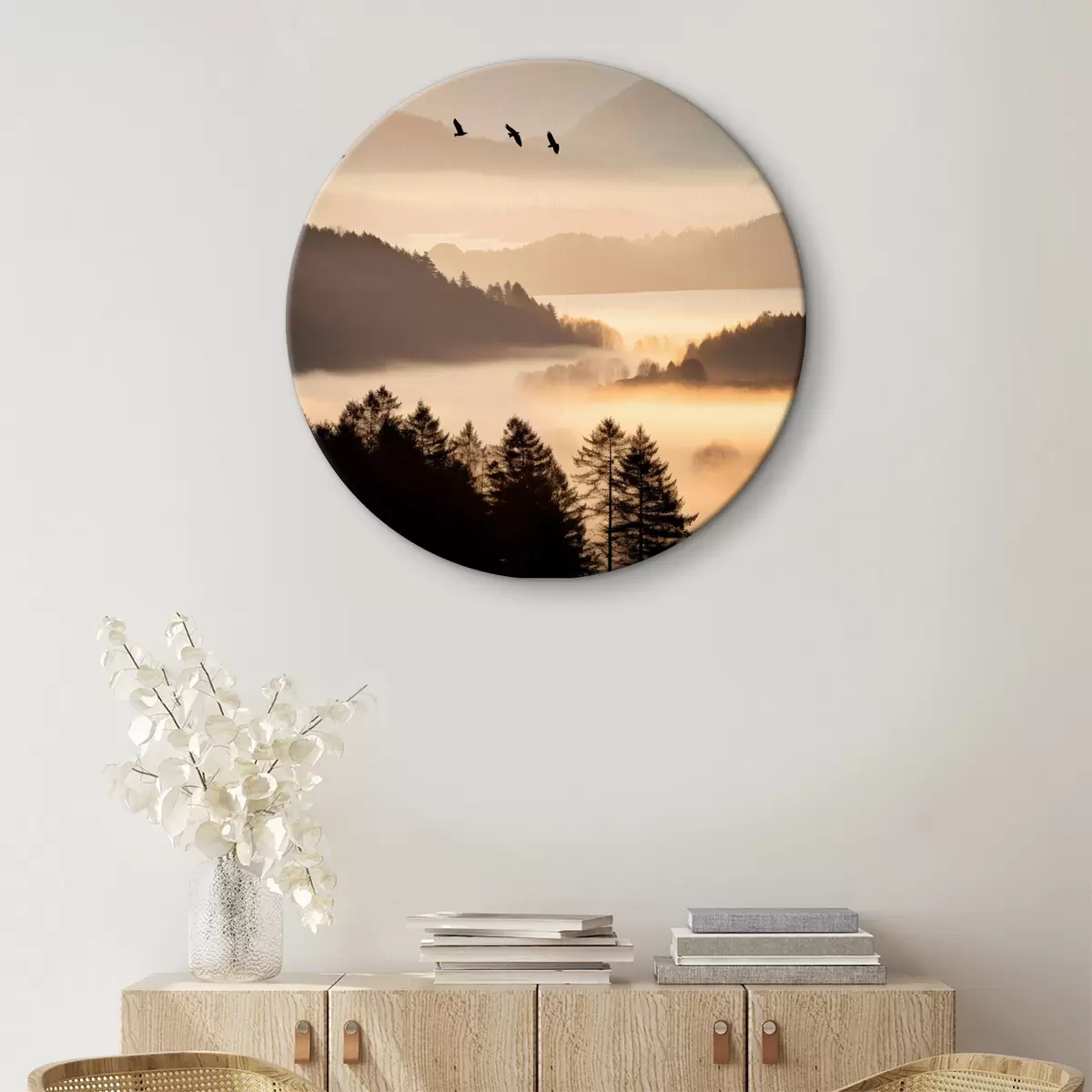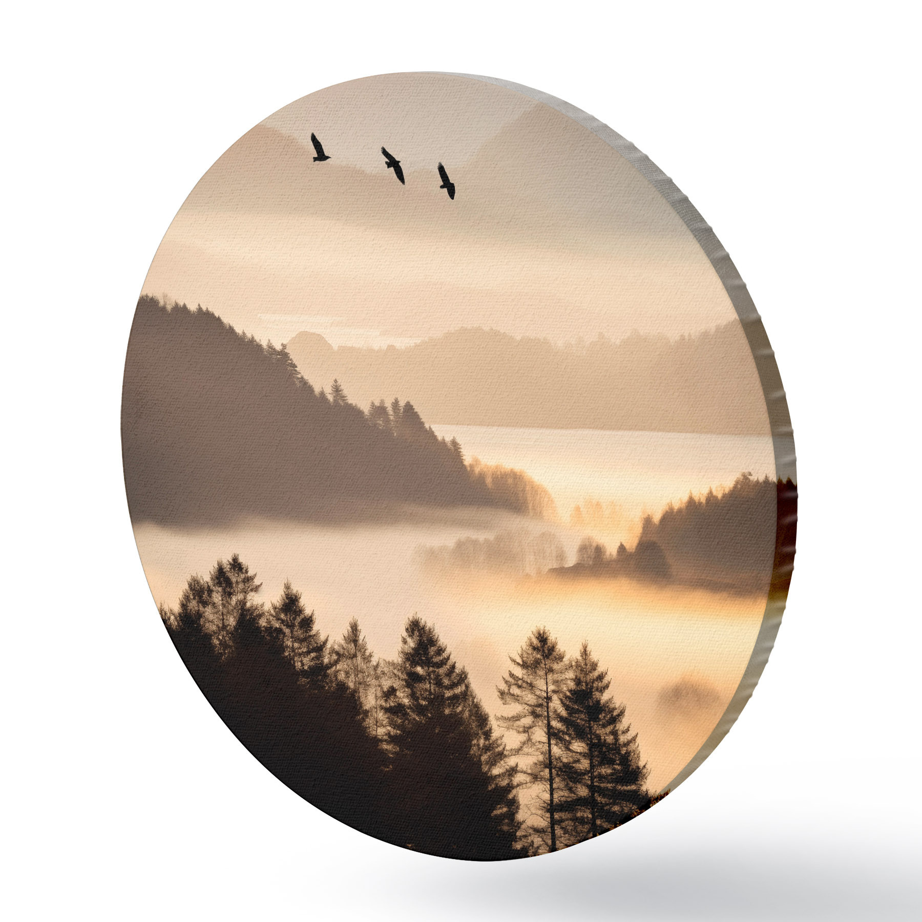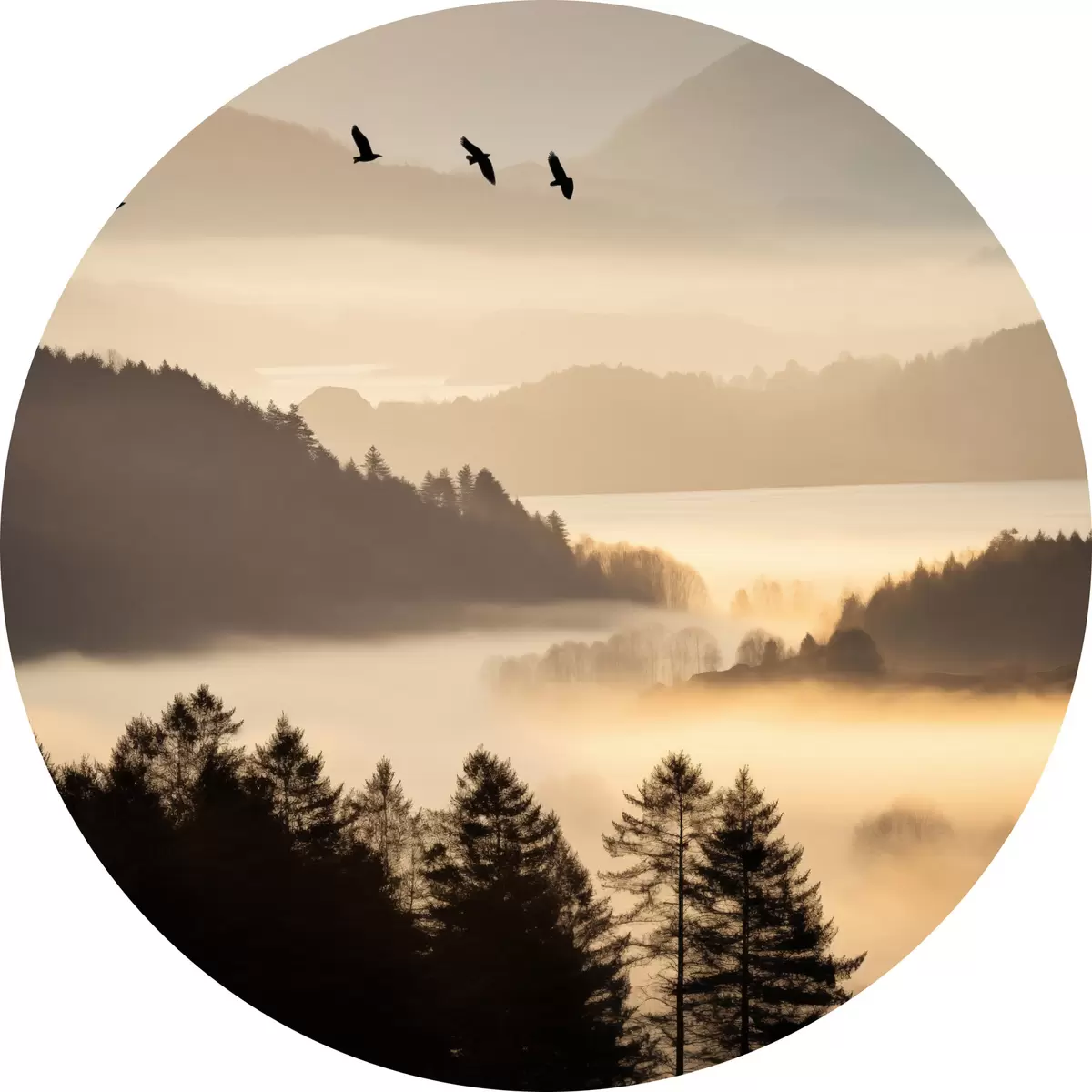 Quadri rotondi Un paesaggio montano con una foresta e uccelli che volano nel cielo, il tutto coperto da uno spesso strato di nebbia durante l'alba r45564