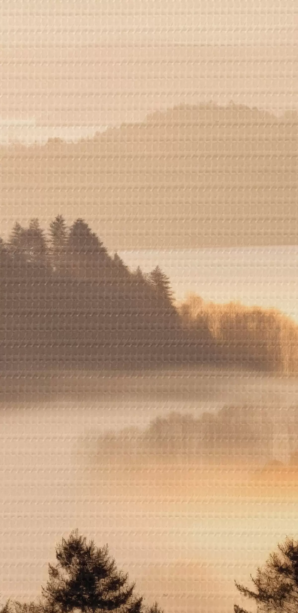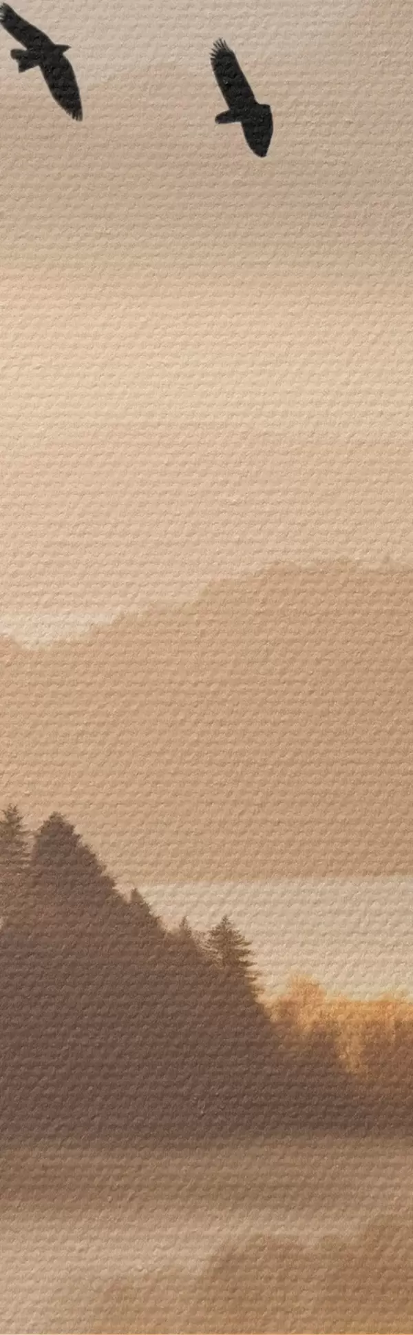 Immagine Un paesaggio montano con una foresta e uccelli che volano nel cielo, il tutto coperto da uno spesso strato di nebbia durante l'alba Nr r45564