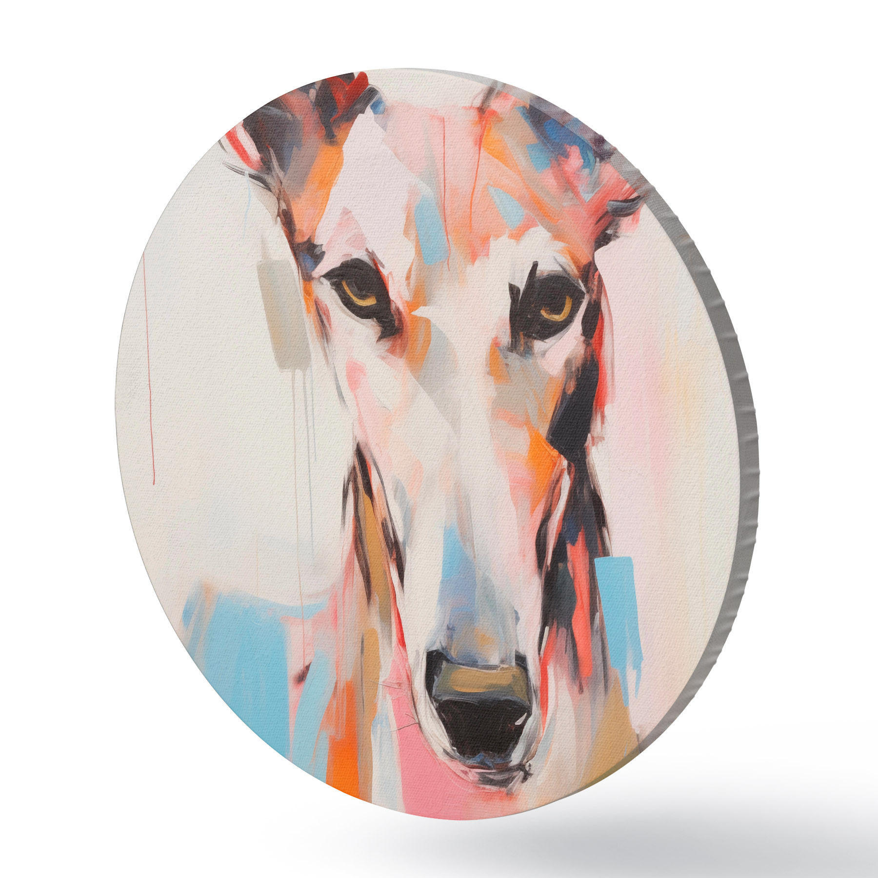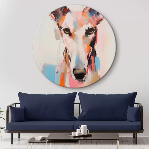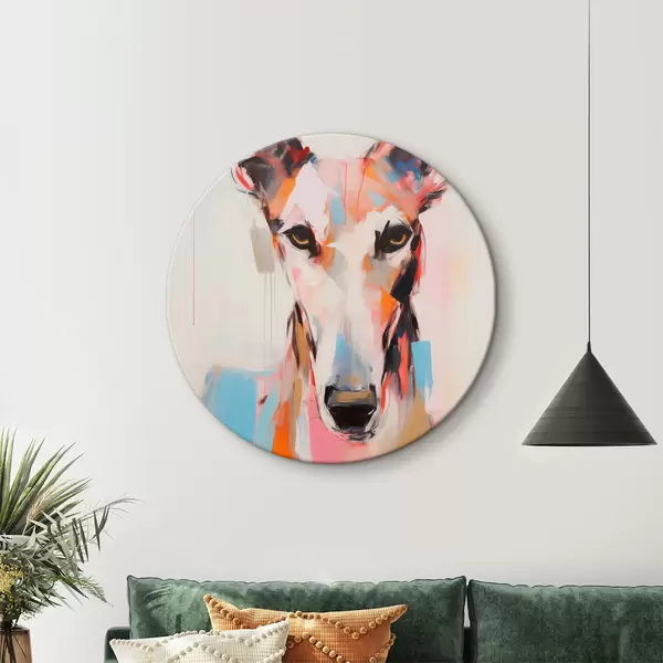Quadri rotondi Un cane levriero, dipinto con colori vivaci come l'arancione, il rosa e il blu, su uno sfondo bianco r45565