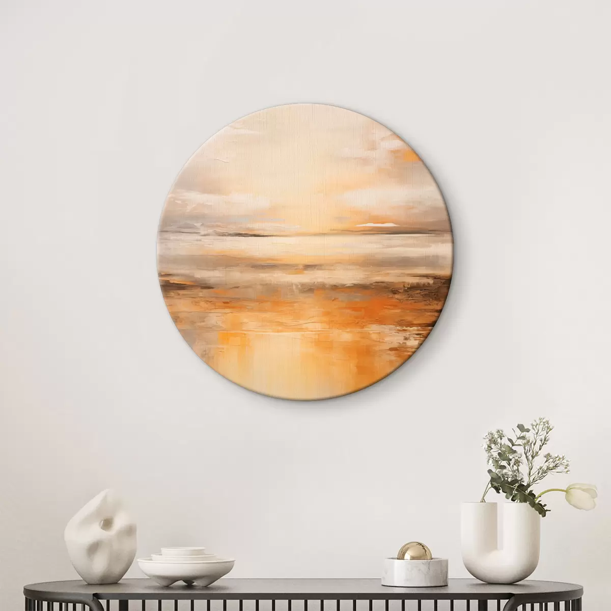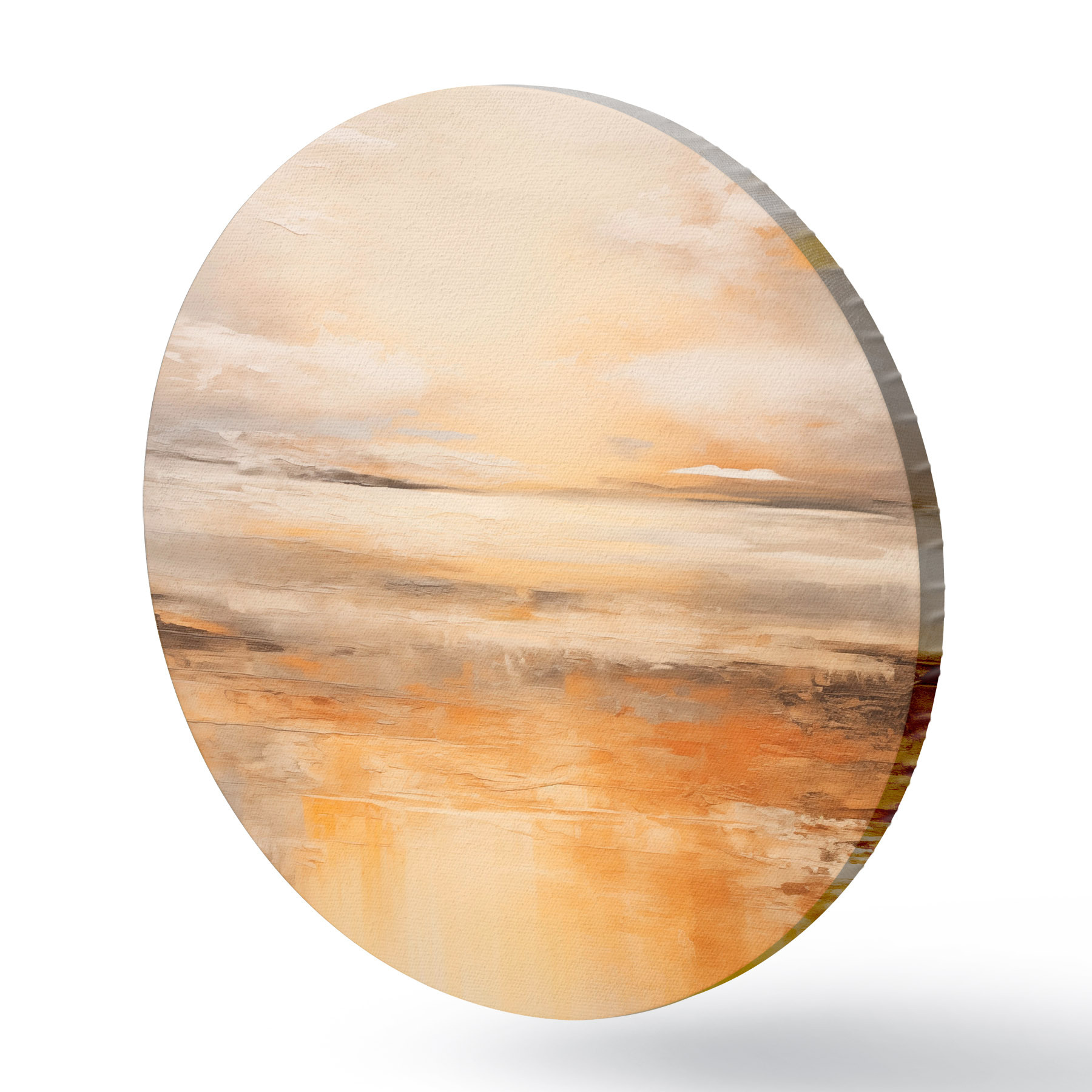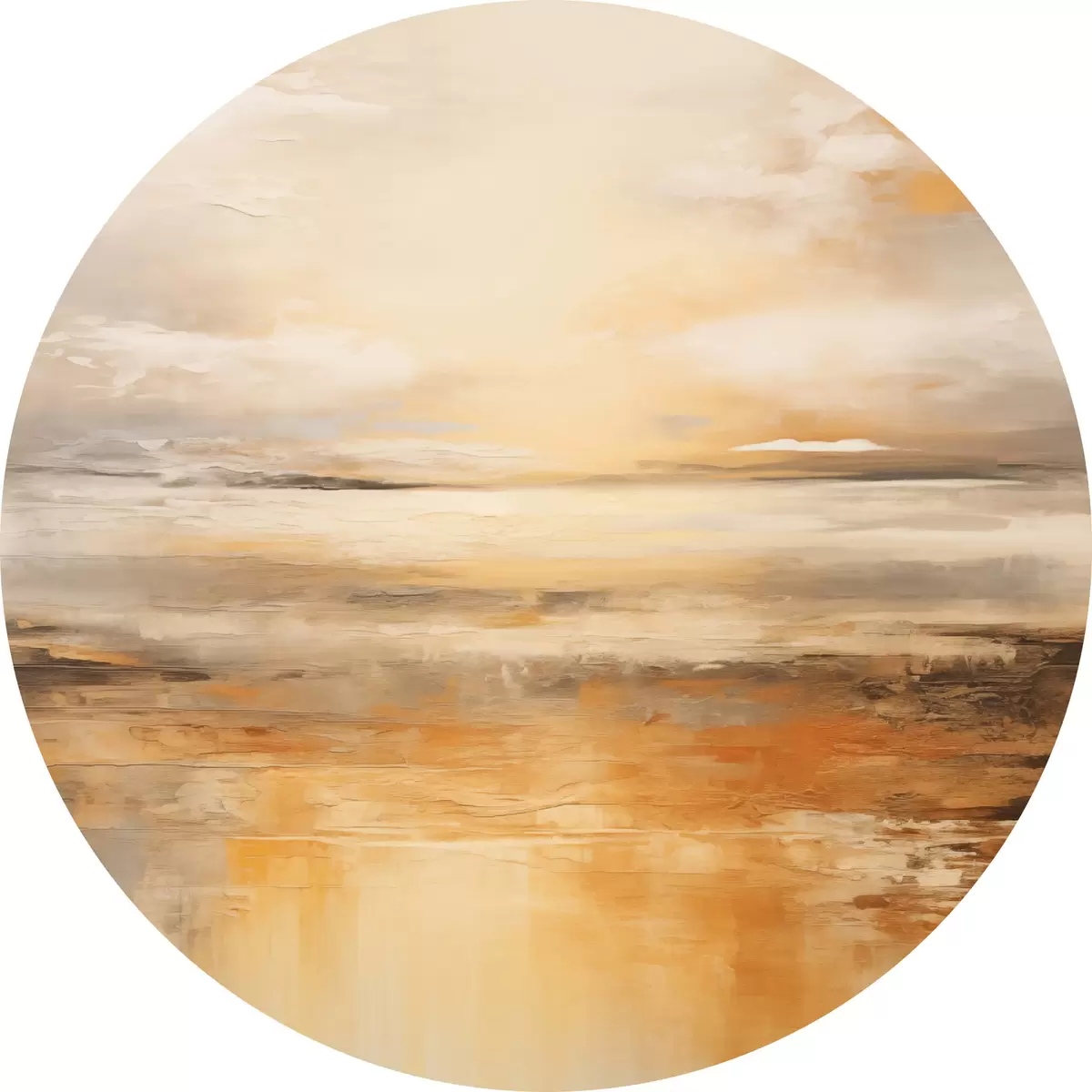 Quadri rotondi Un dipinto astratto di un paesaggio di spiaggia con un oceano calmo, sabbia arancione e un cielo nuvoloso con sole r45567