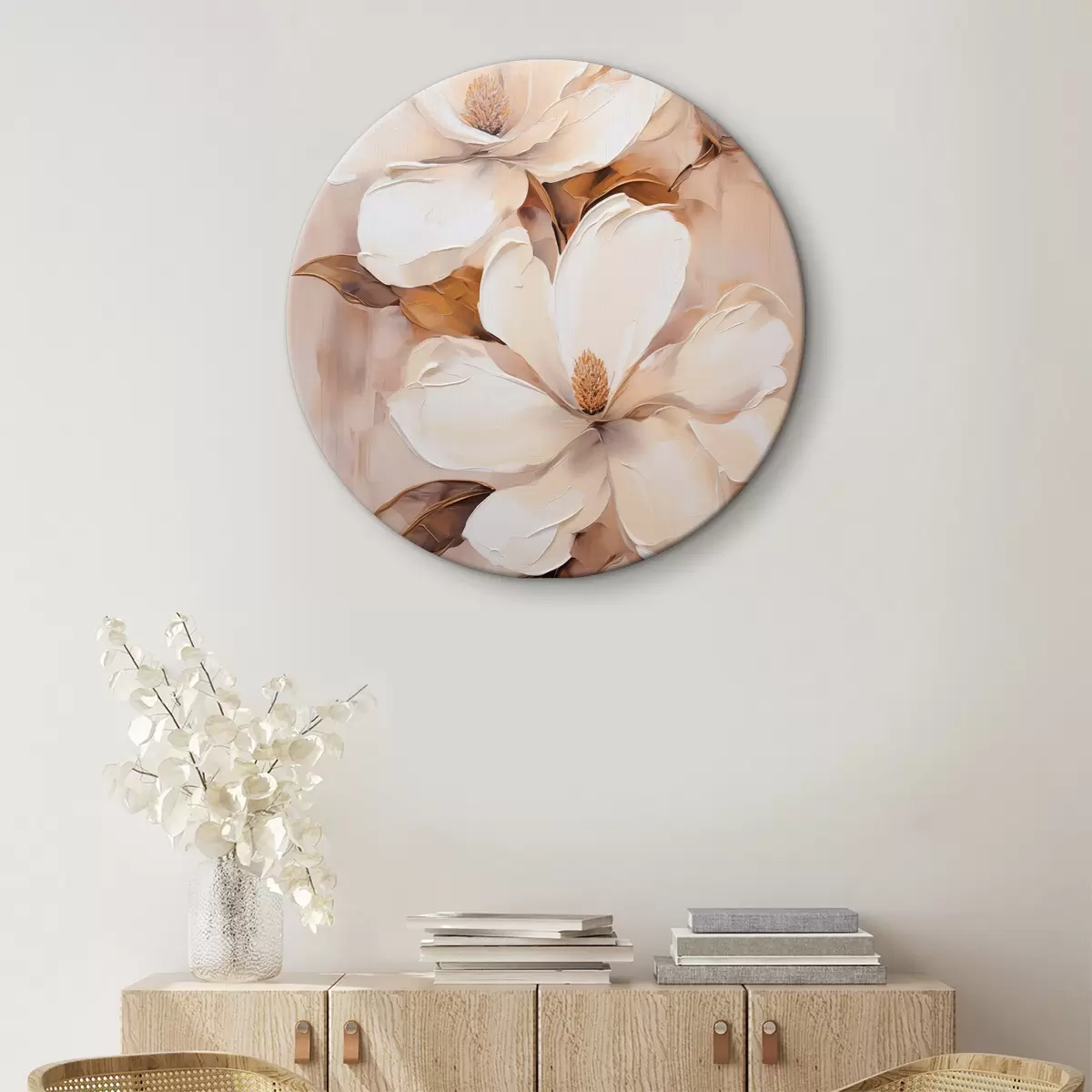 Quadri rotondi Fiori di magnolia bianchi su uno sfondo morbido e sfocato di tonalità beige e marrone, stile pittura r45572