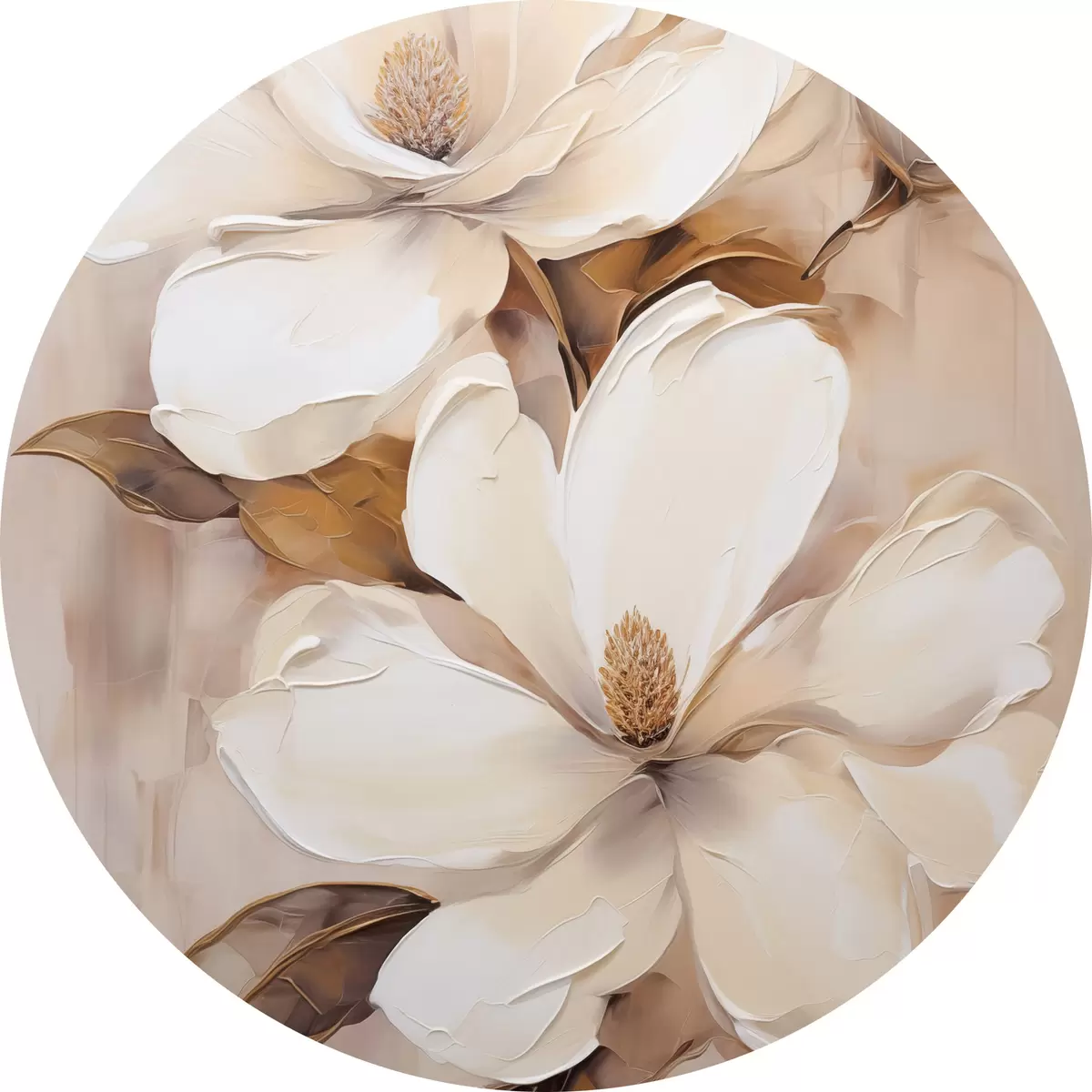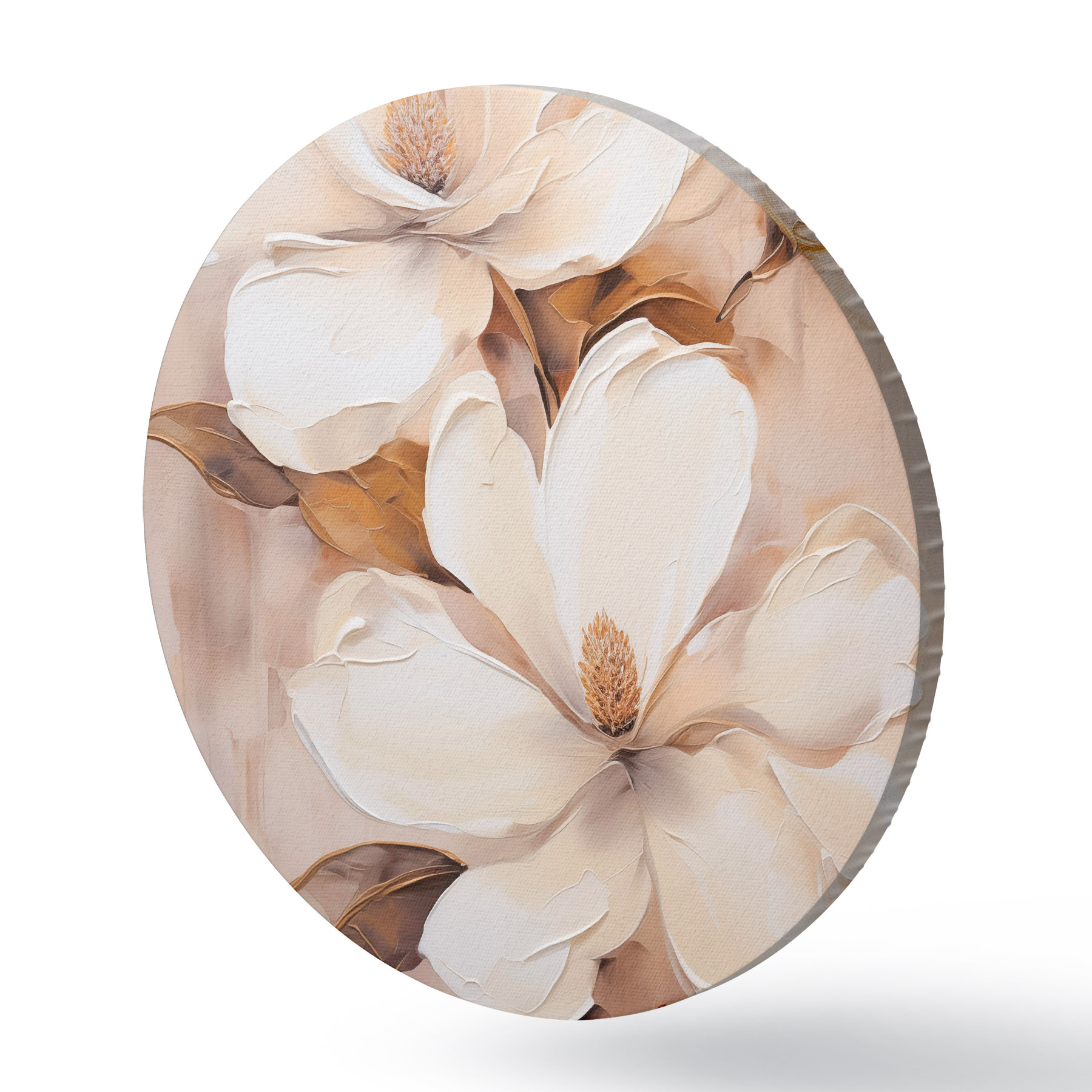 Quadri rotondi Fiori di magnolia bianchi su uno sfondo morbido e sfocato di tonalità beige e marrone, stile pittura r45572