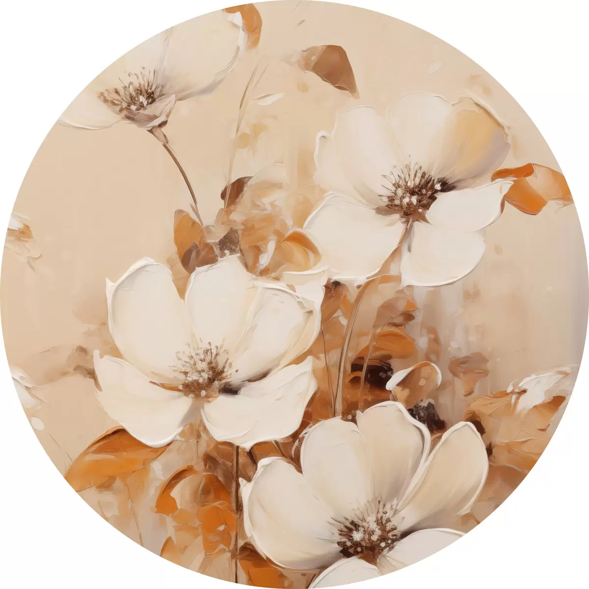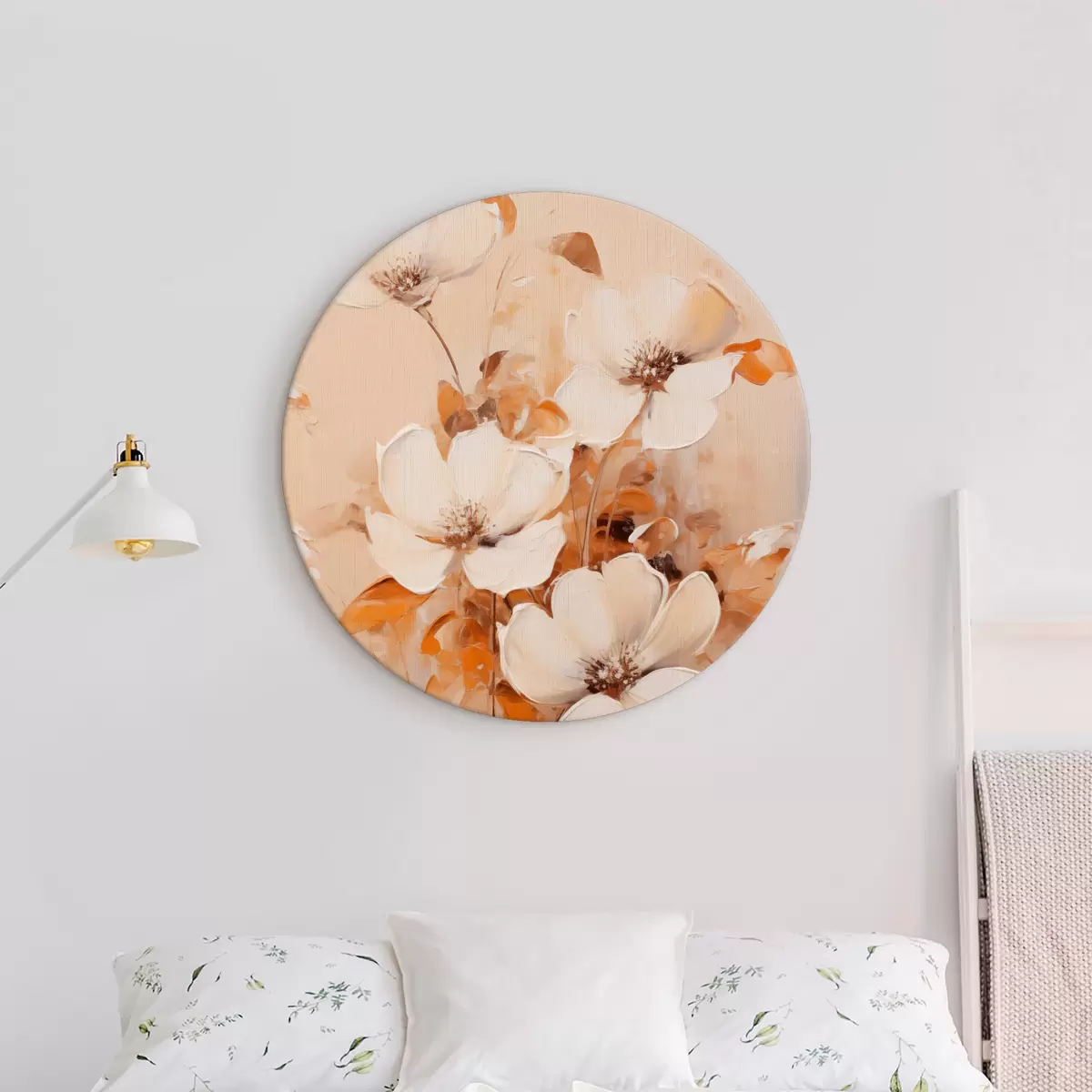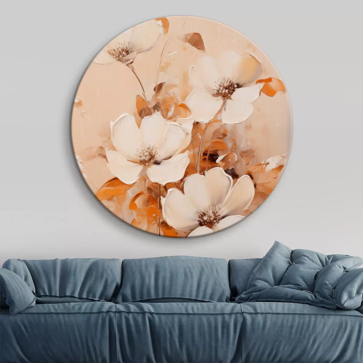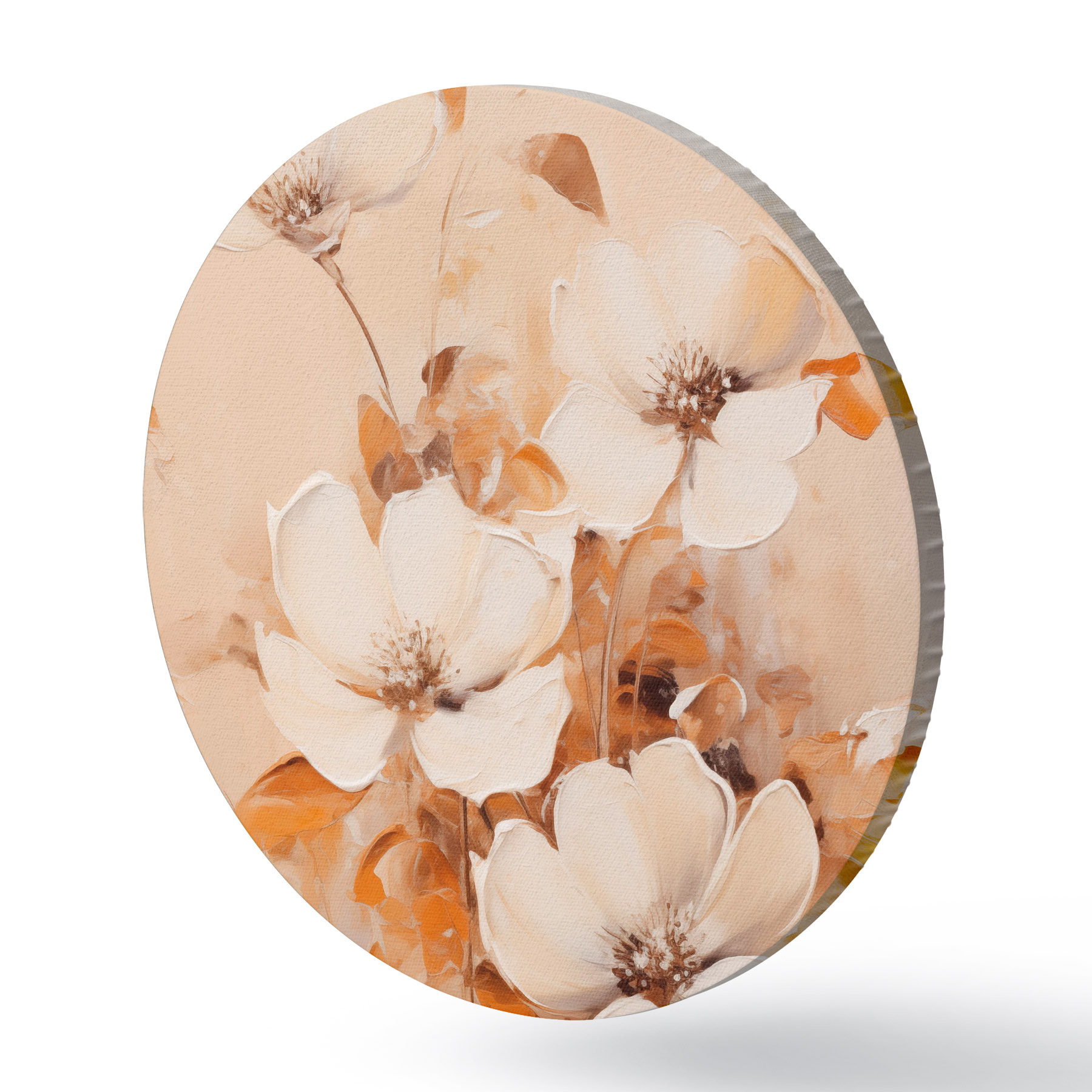Quadri rotondi Fiori bianchi con foglie arancioni, pennellate delicate, tavolozza di colori caldi, composizione elegante r45573
