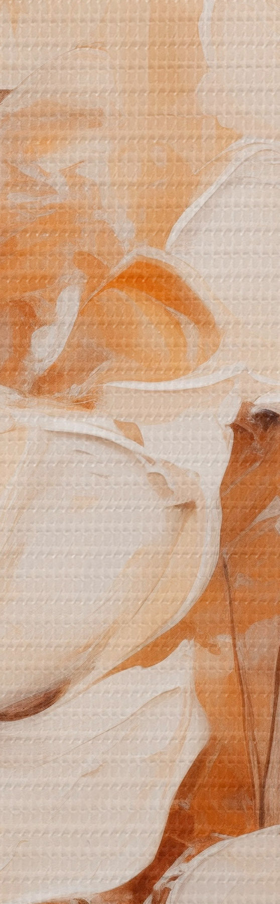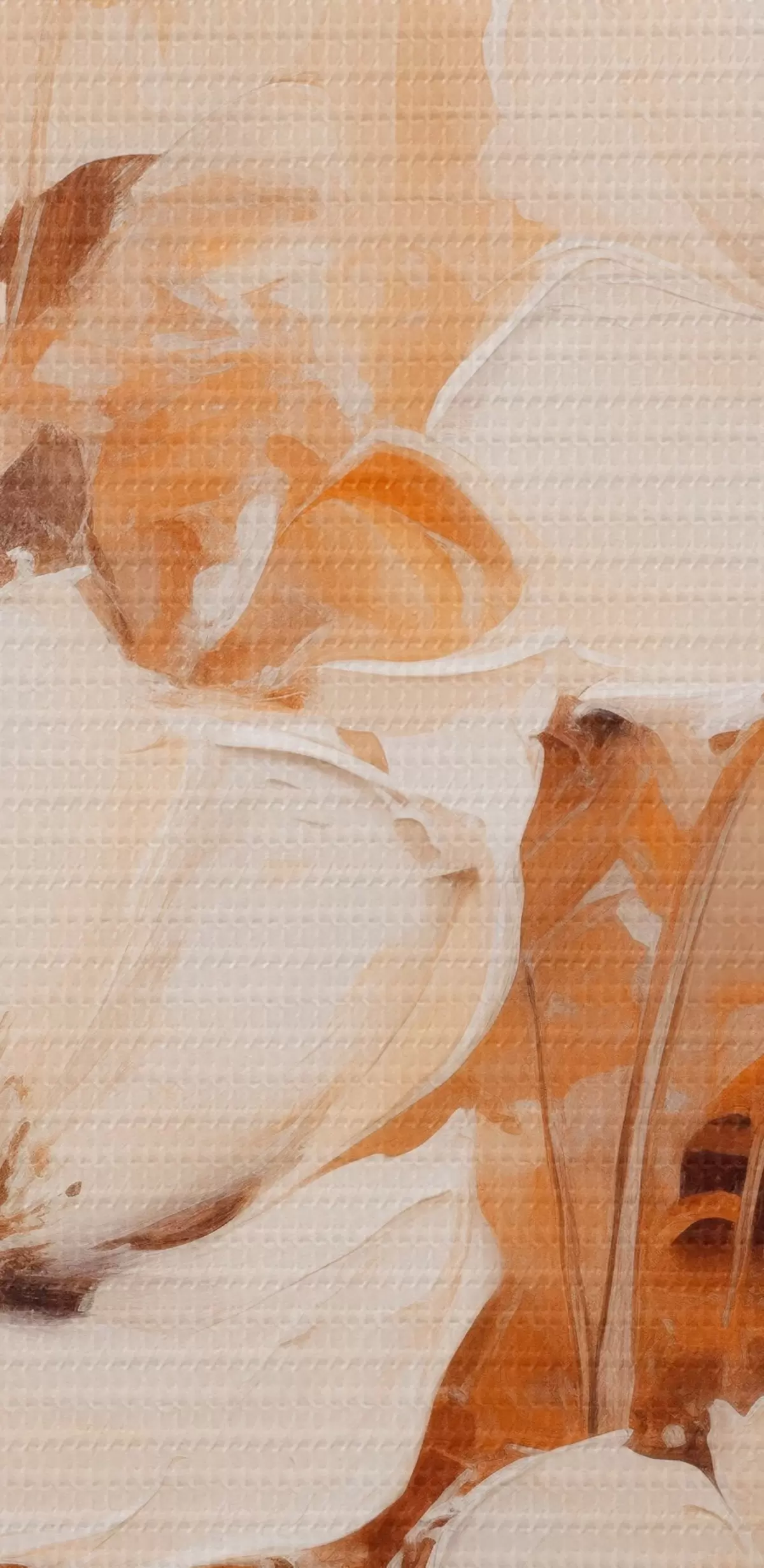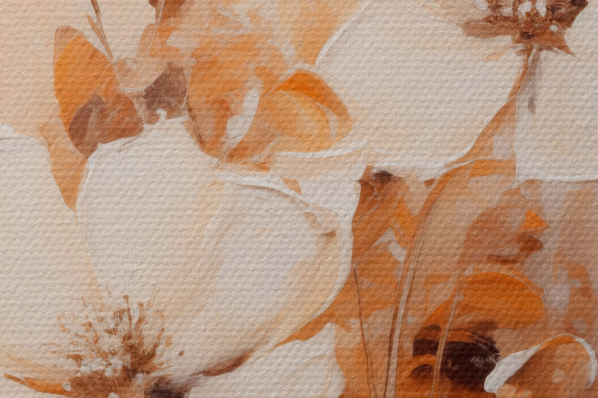 Immagine Fiori bianchi con foglie arancioni, pennellate delicate, tavolozza di colori caldi, composizione elegante Nr r45573