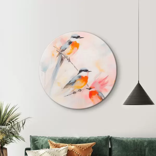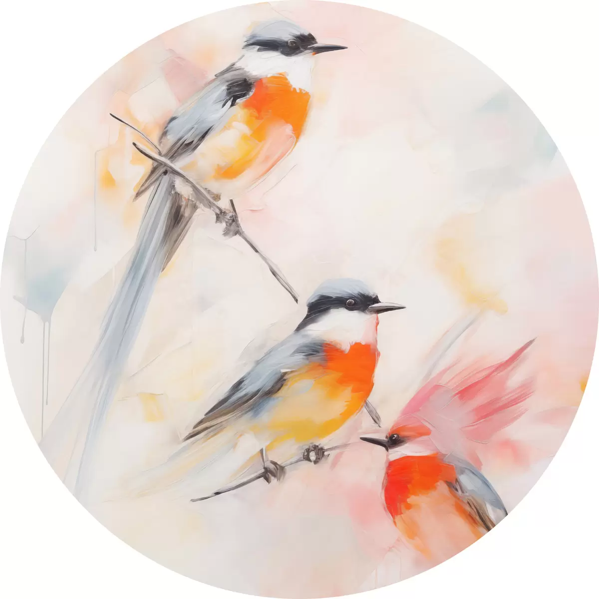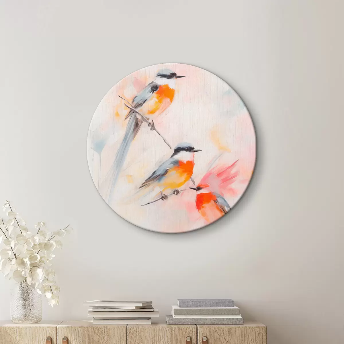 Quadri rotondi Uccelli appollaiati sui rami, colori pastello tenui, sfondo chiaro con sfumature rosa e bianche r45577