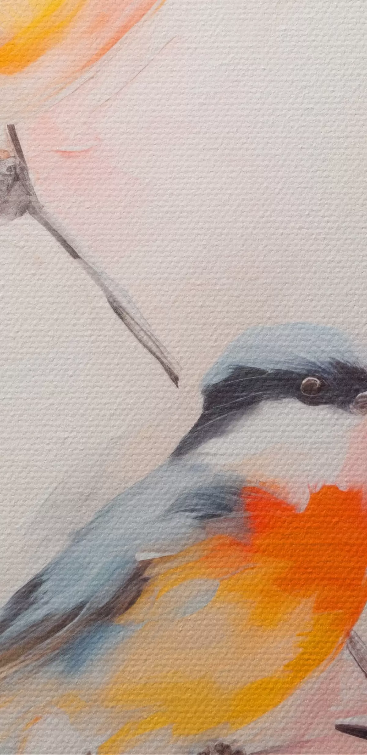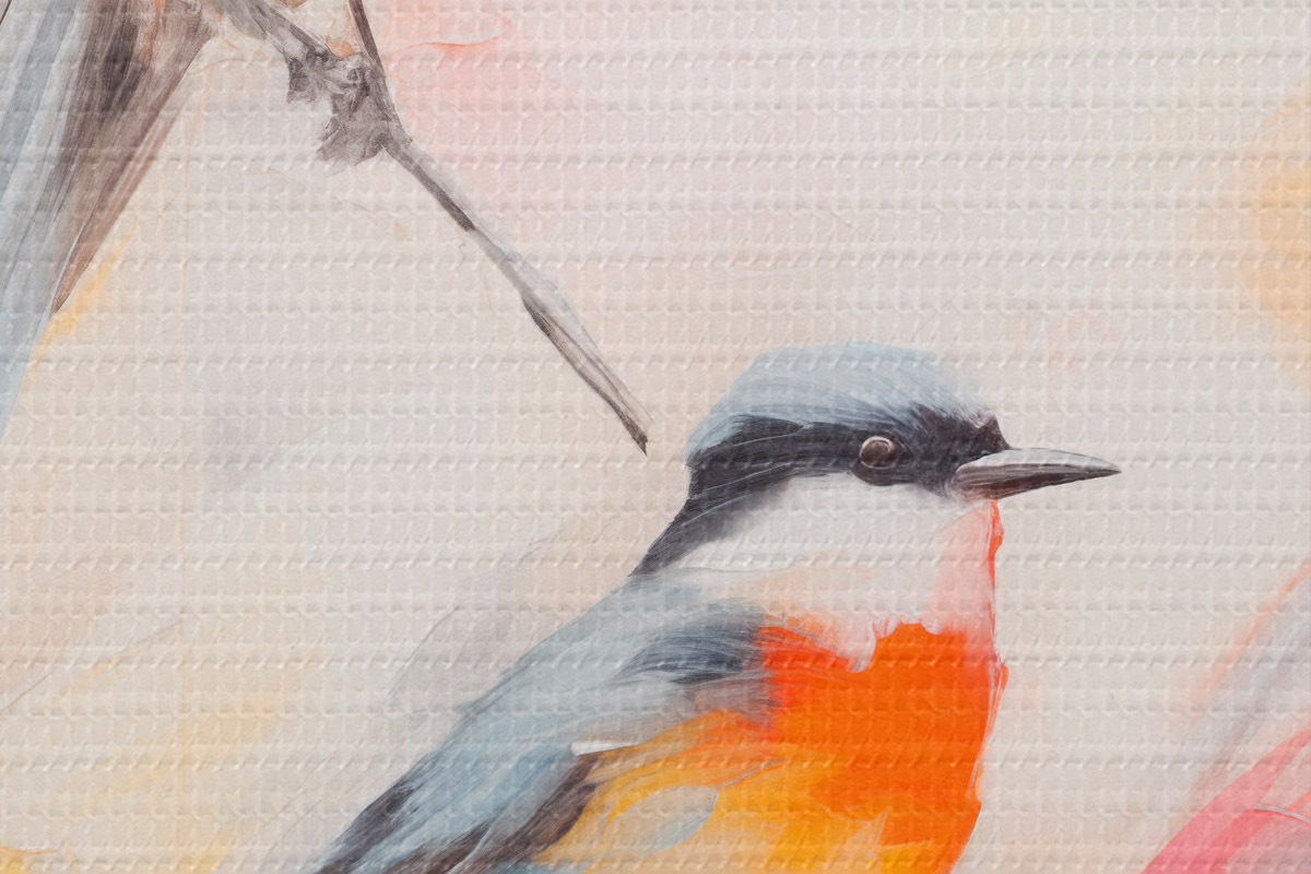 Immagine Uccelli appollaiati sui rami, colori pastello tenui, sfondo chiaro con sfumature rosa e bianche Nr r45577