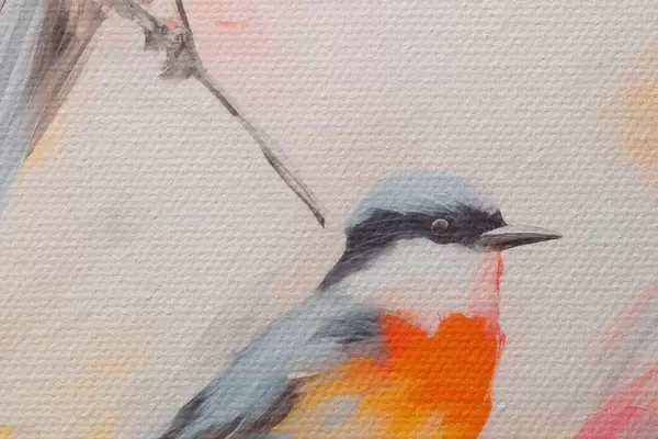 Immagine Uccelli appollaiati sui rami, colori pastello tenui, sfondo chiaro con sfumature rosa e bianche Nr r45577