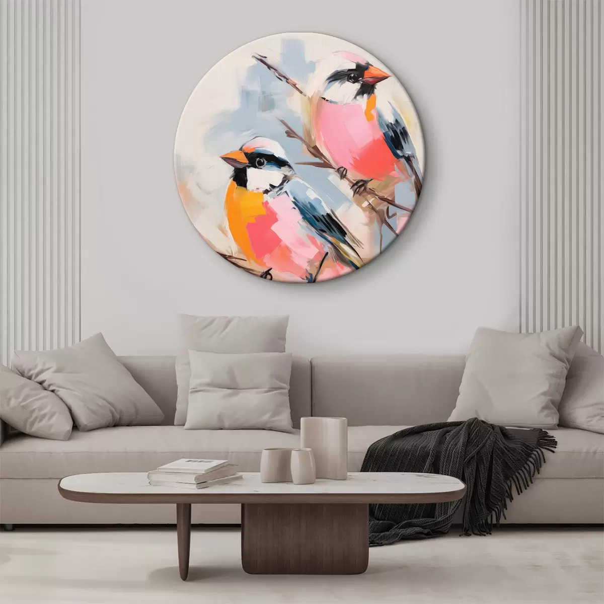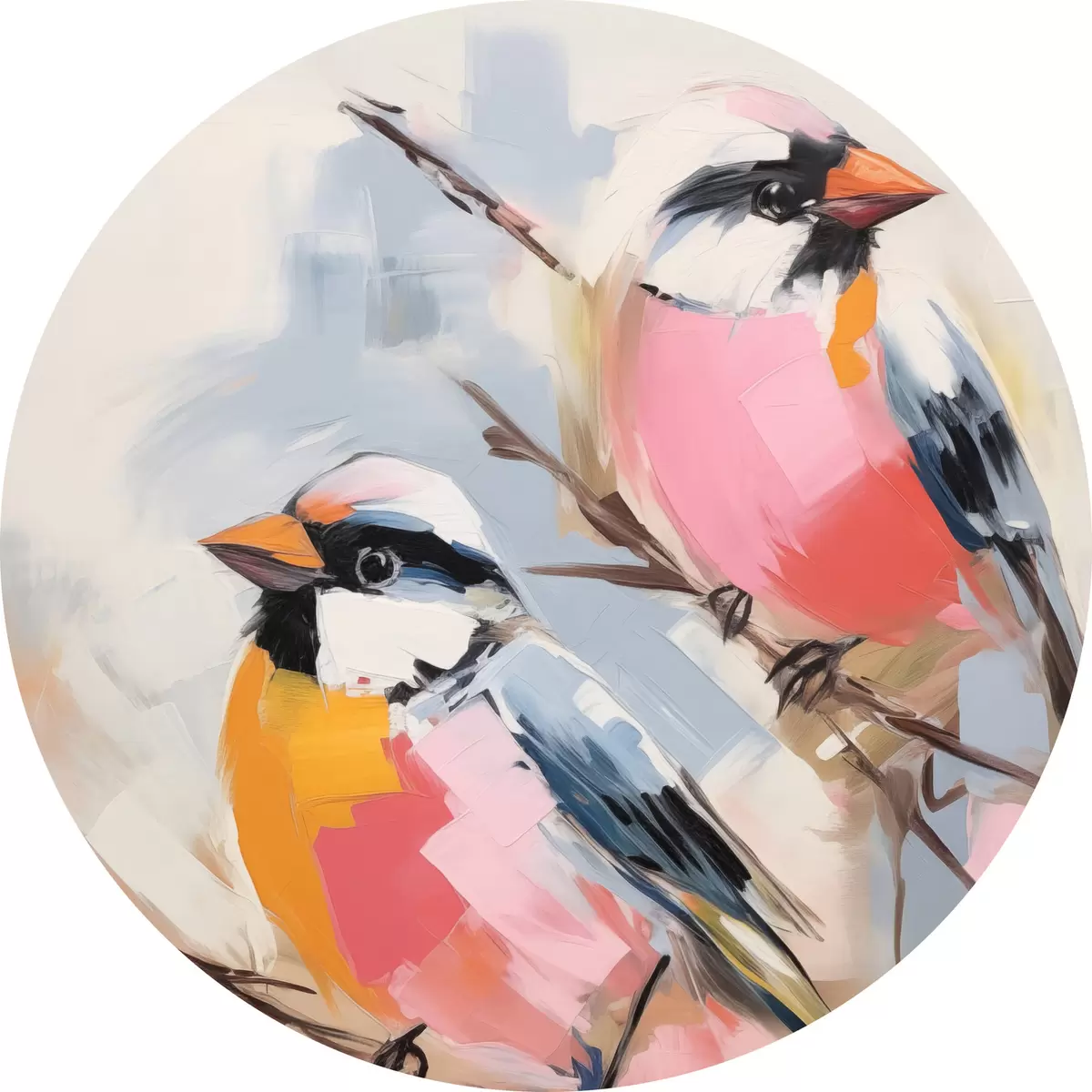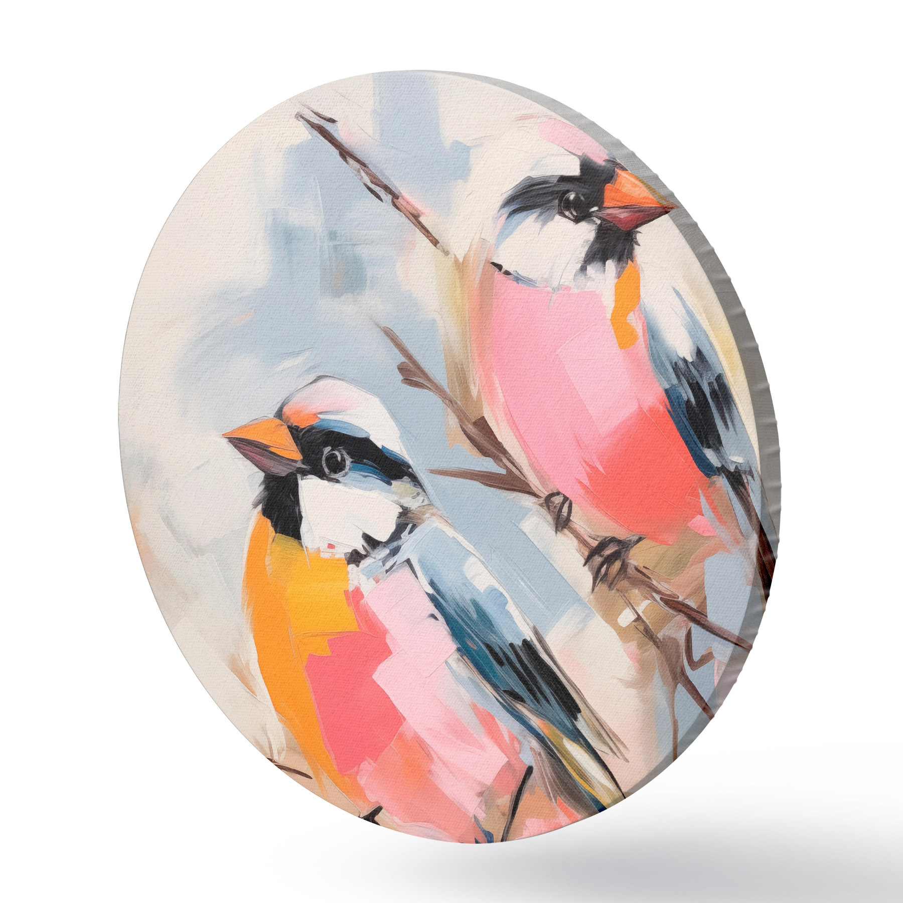 Quadri rotondi Uccelli colorati appollaiati su un ramo su un morbido sfondo color pastello r45578