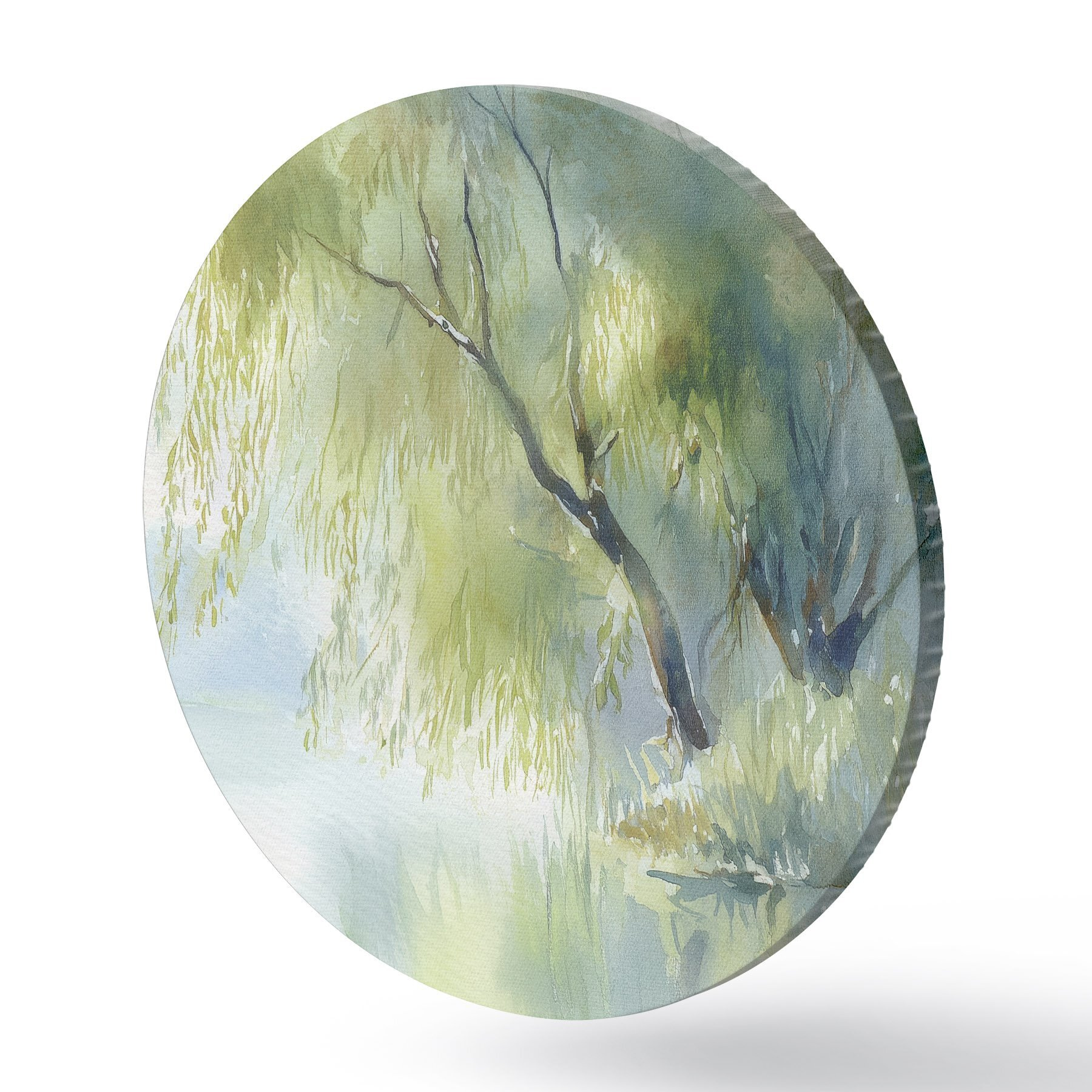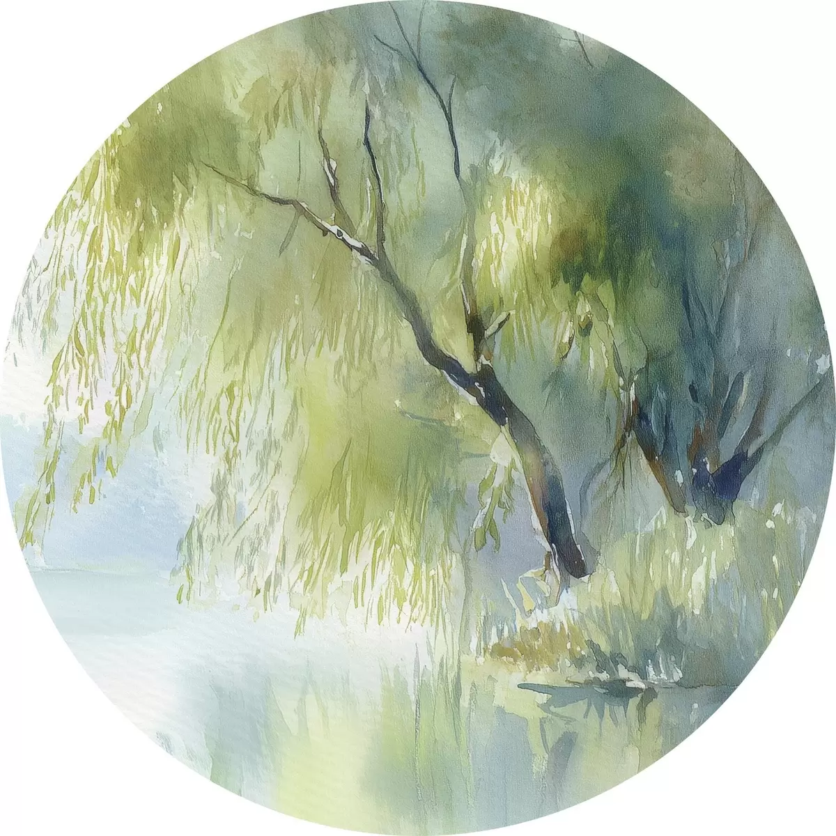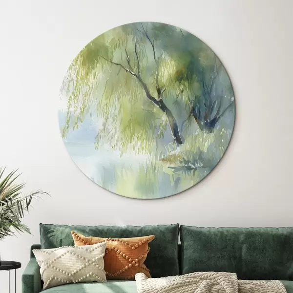 Quadri rotondi salice sulla riva del lago in stile acquerello r45715