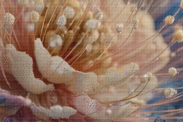 Immagine Fiore perlato con gocce di rugiada, petali color pesca e blu Nr r45911
