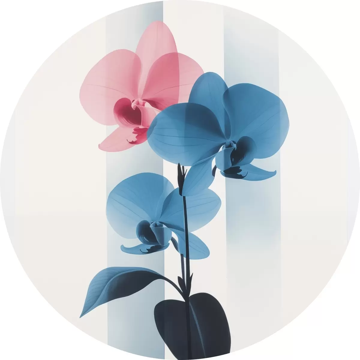 Quadri rotondi Orchidee con foglie su sfondo bianco con strisce verticali r45925