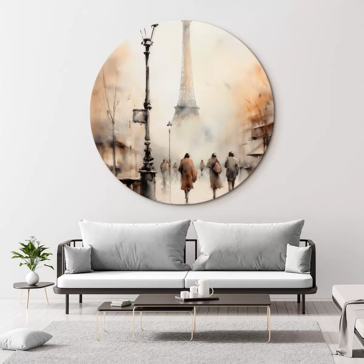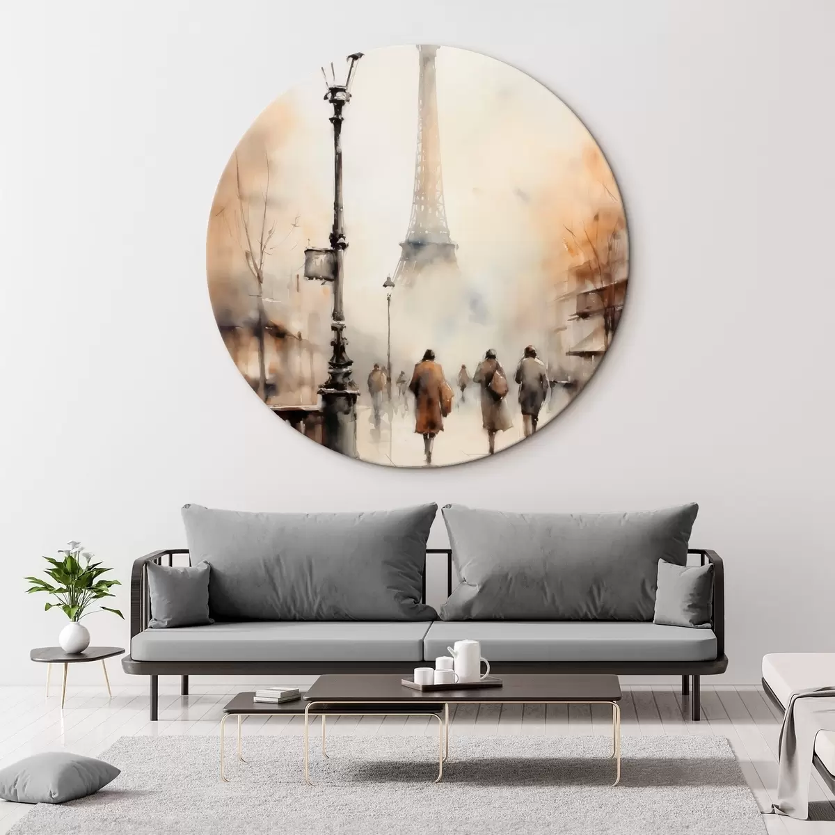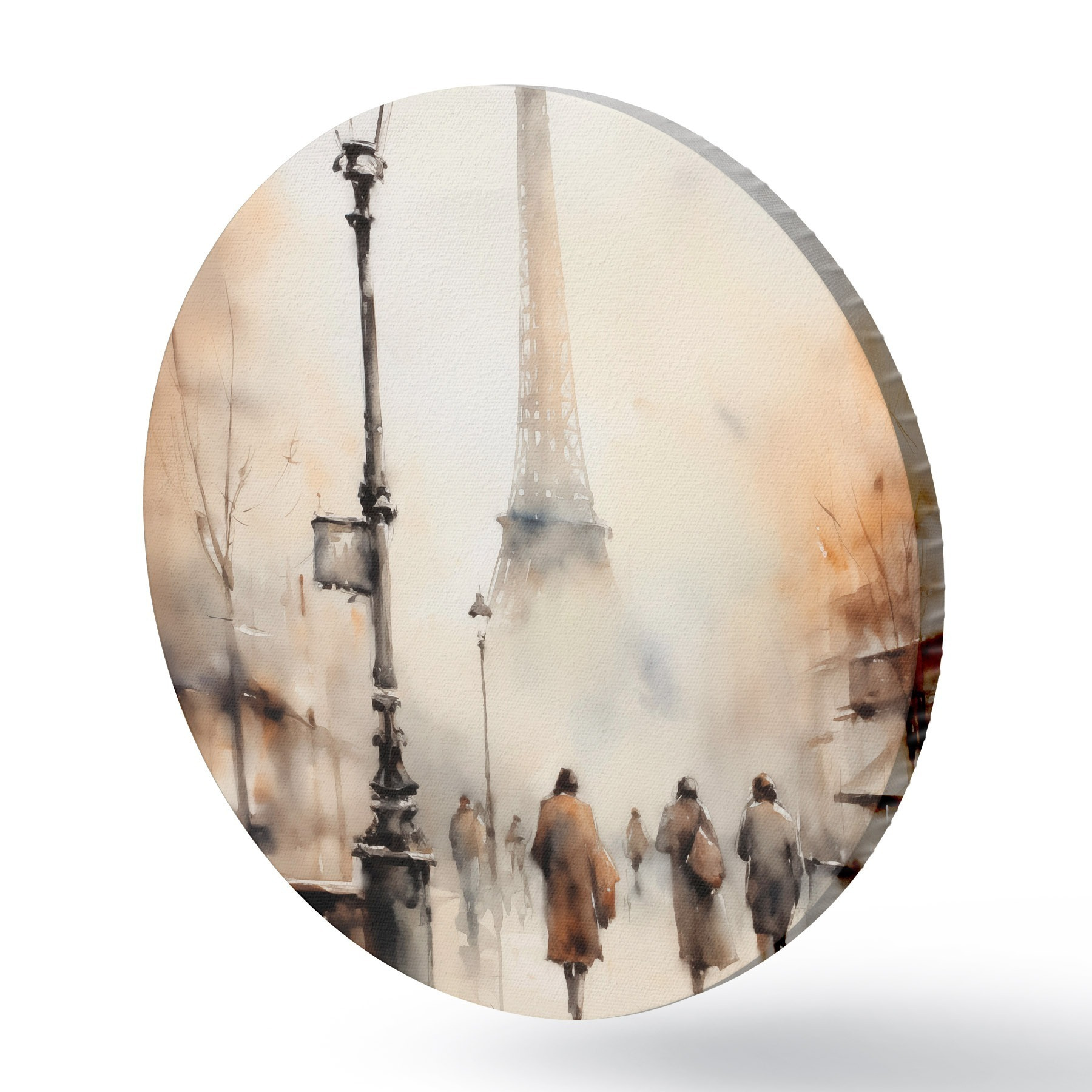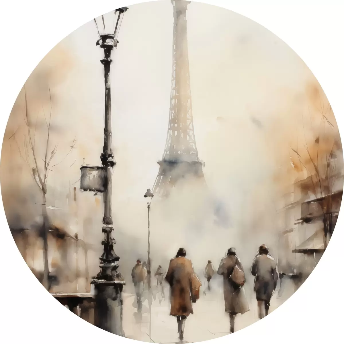 Quadri rotondi Una piovosa giornata autunnale a Parigi con la Torre Eiffel sullo sfondo e lampioni vintage r45931