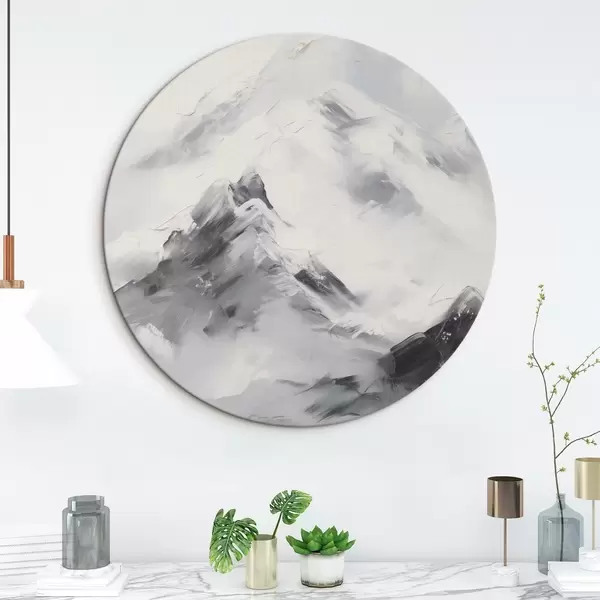 Quadri rotondi Cime innevate con ombre grigie, cielo grigio, pennellate, texture, minimalista r45933