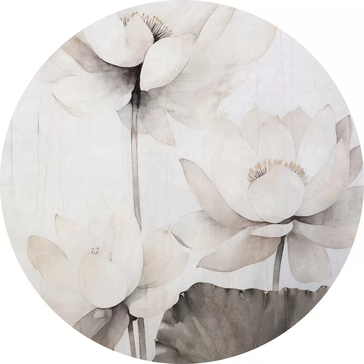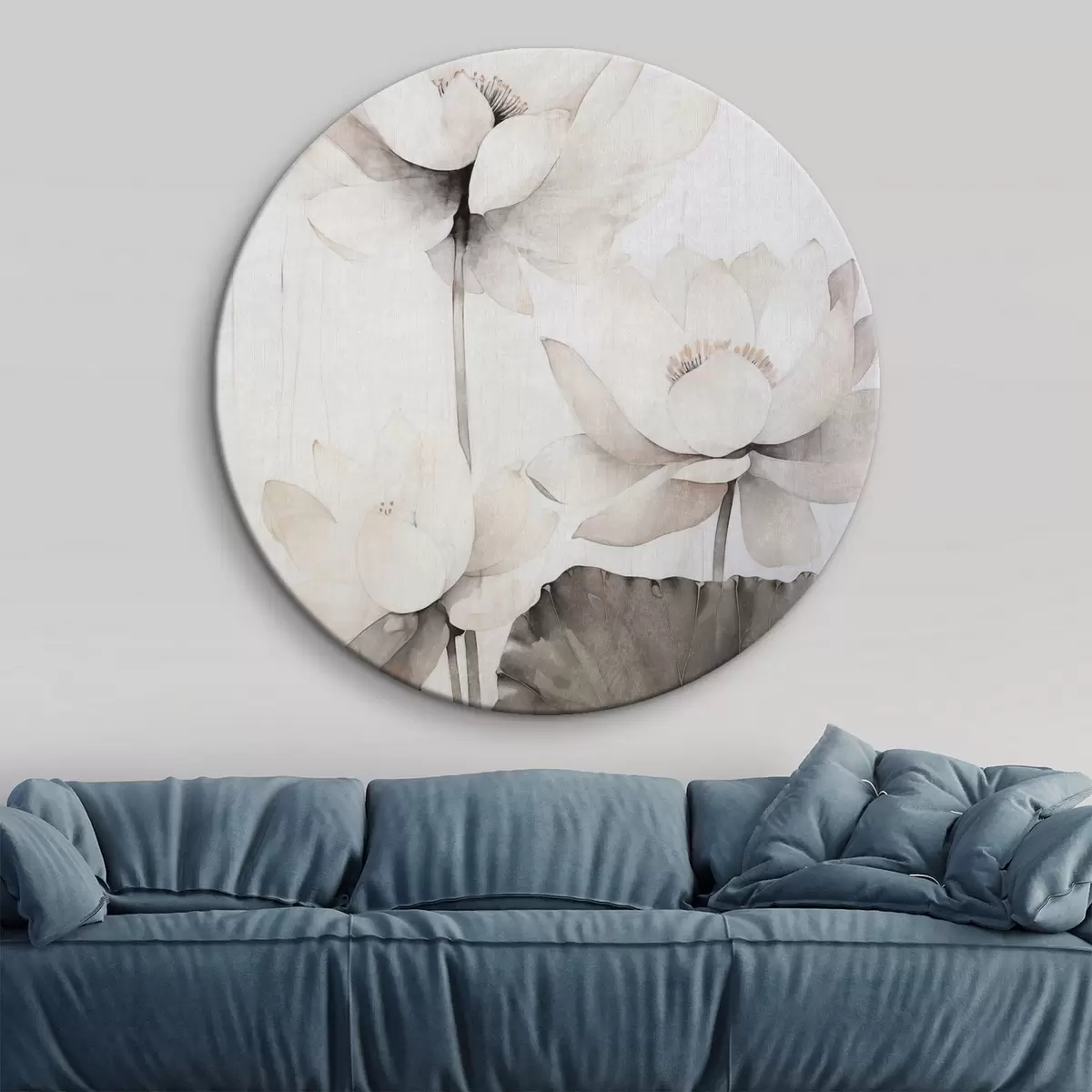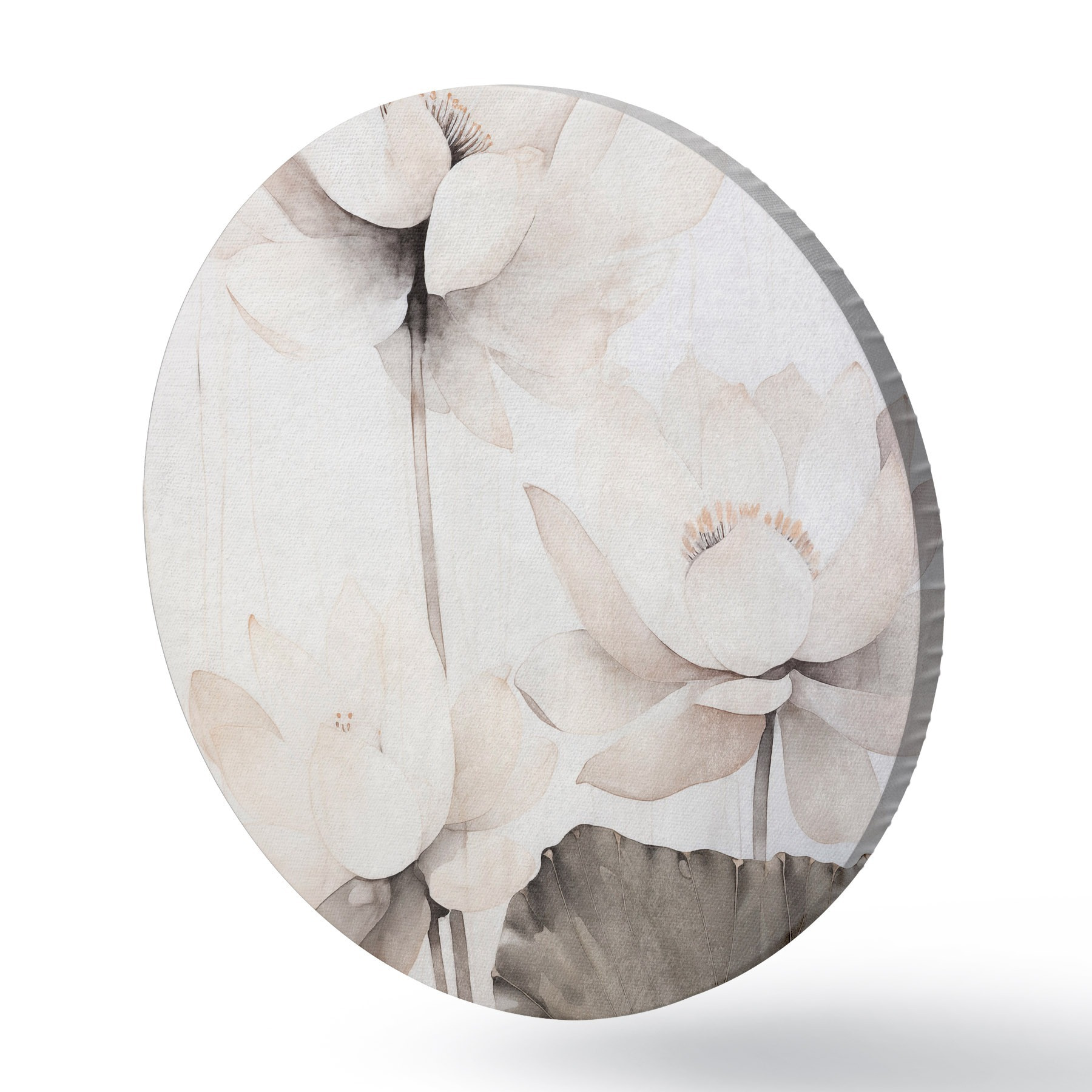Quadri rotondi Fiori di loto bianchi con foglie scure, sfondo chiaro, design minimalista r45936