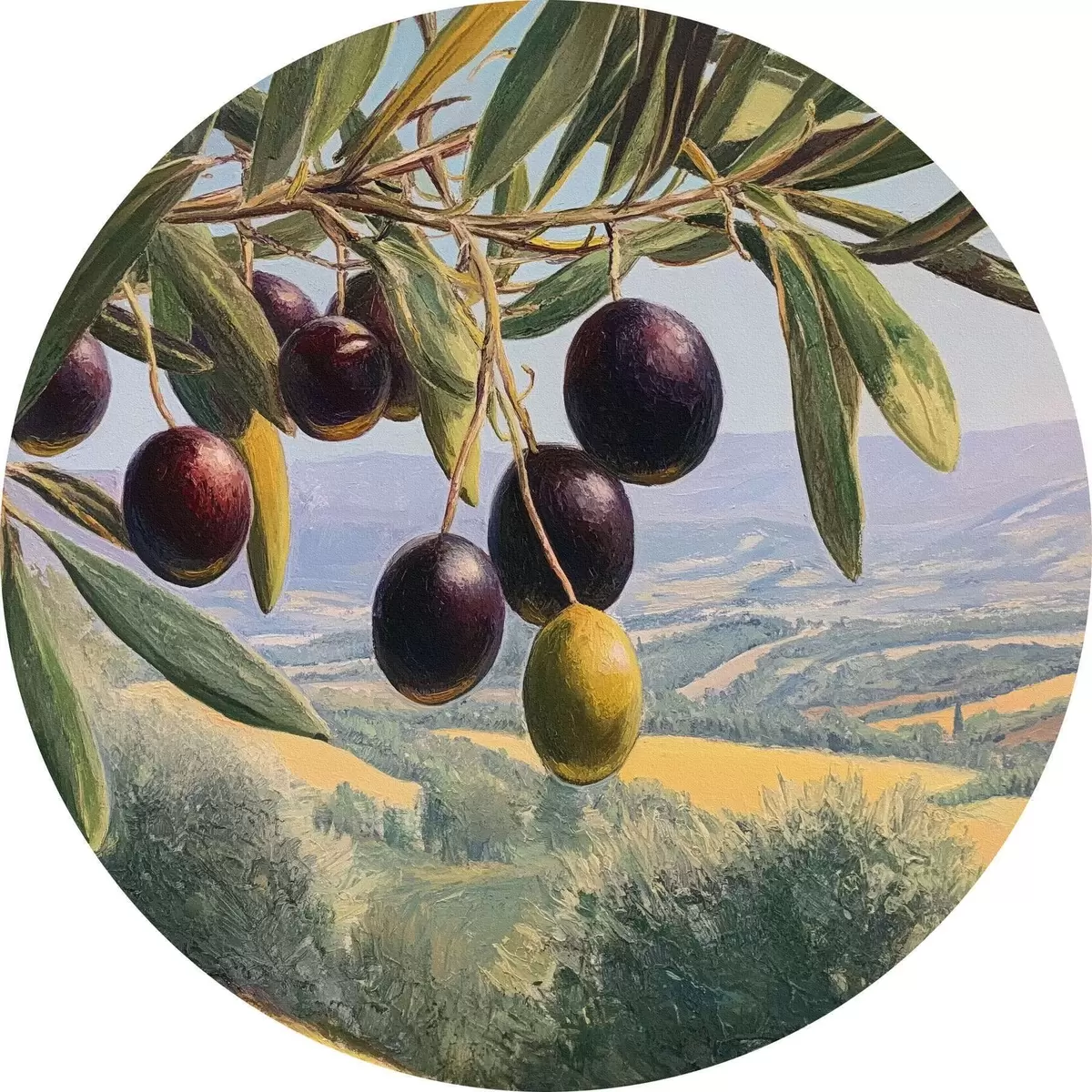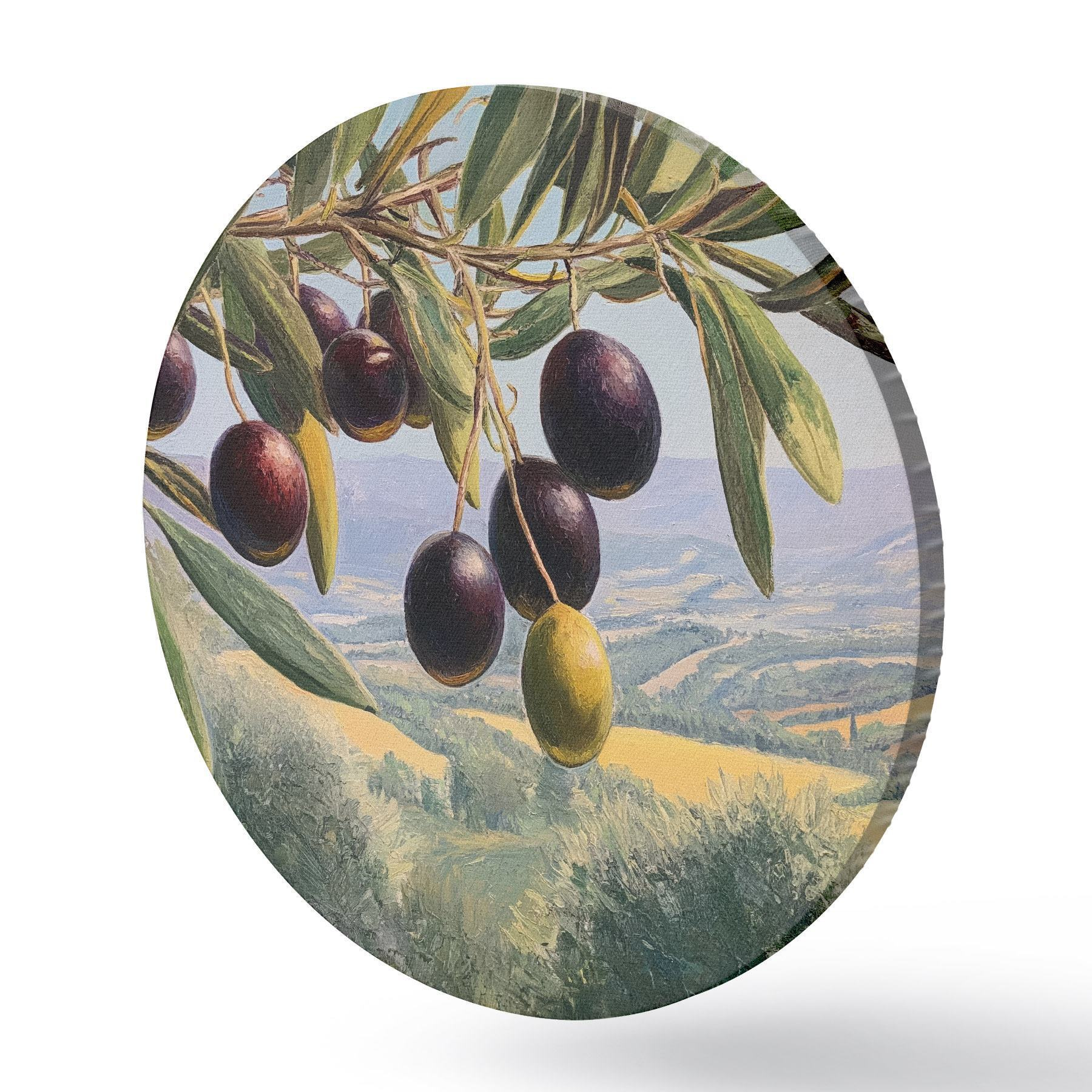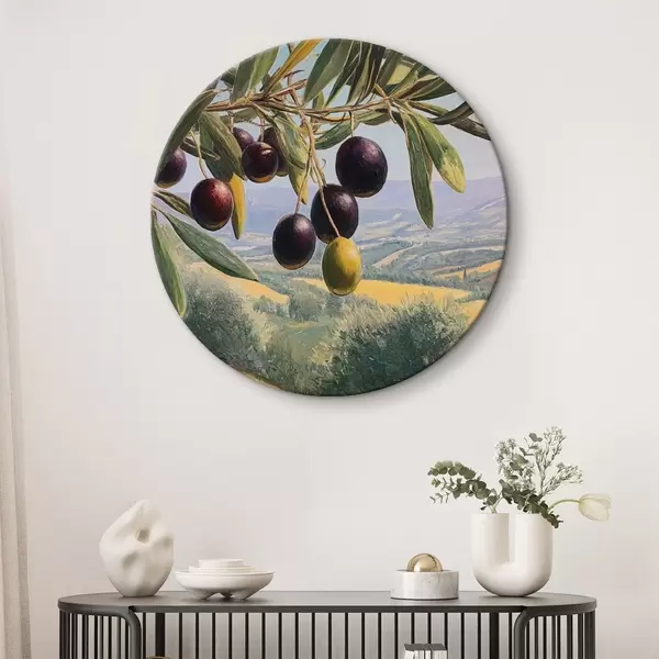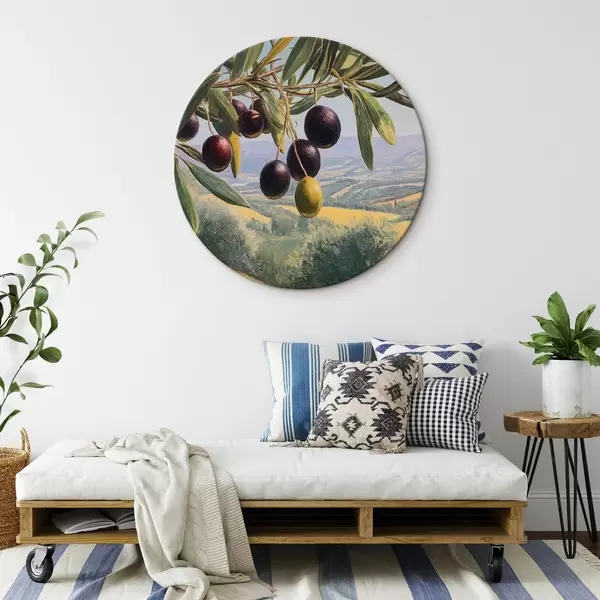 Quadri rotondi Ramo d'ulivo con frutti scuri su uno sfondo estivo r46150